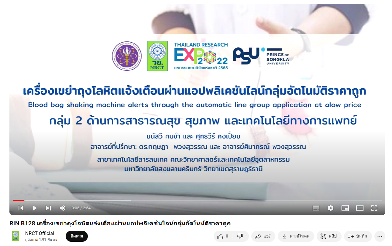 - ผลงานสายนวัตกรรมอุดมศึกษา ประจำปี 2565 ด้านการสาธารณสุข สุขภาพ และเทคโนโลยีทางการแพทย์: เครื่องเขย่าถุงโลหิตแจ้งเตือนผ่านแอปพลิเคชันไลน์กลุ่มอัตโนมัติราคาถูก