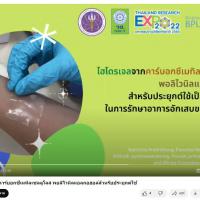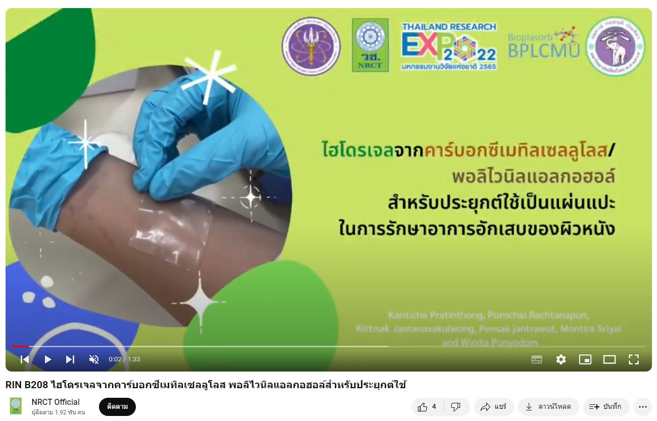- ผลงานสายนวัตกรรมอุดมศึกษา ประจำปี 2565 ด้านการสาธารณสุข สุขภาพ และเทคโนโลยีทางการแพทย์: ไฮโดรเจลจากคาร์บอกซีเมทิลเซลลูโลส พอลิไวนิลแอลกอฮอล์สำหรับประยุกต์ใช้