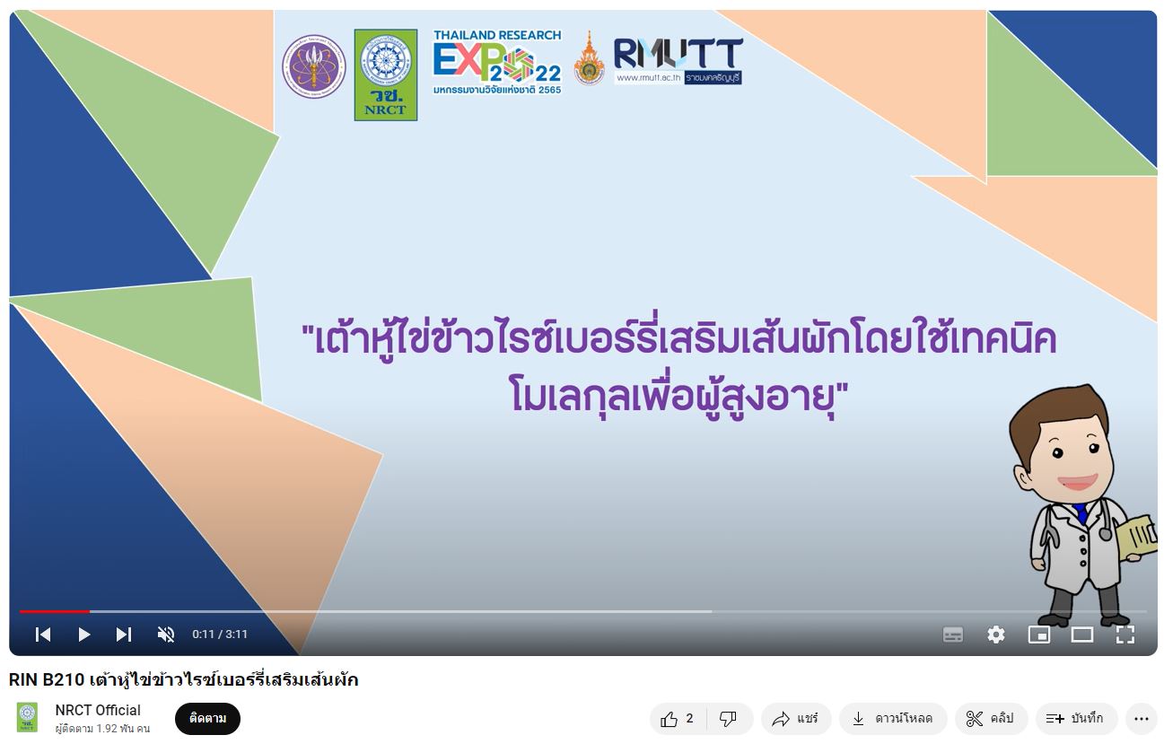 - ผลงานสายนวัตกรรมอุดมศึกษา ประจำปี 2565 ด้านการสาธารณสุข สุขภาพ และเทคโนโลยีทางการแพทย์: เต้าหู้ไข่ข้าวไรซ์เบอร์รี่เสริมเส้นผัก