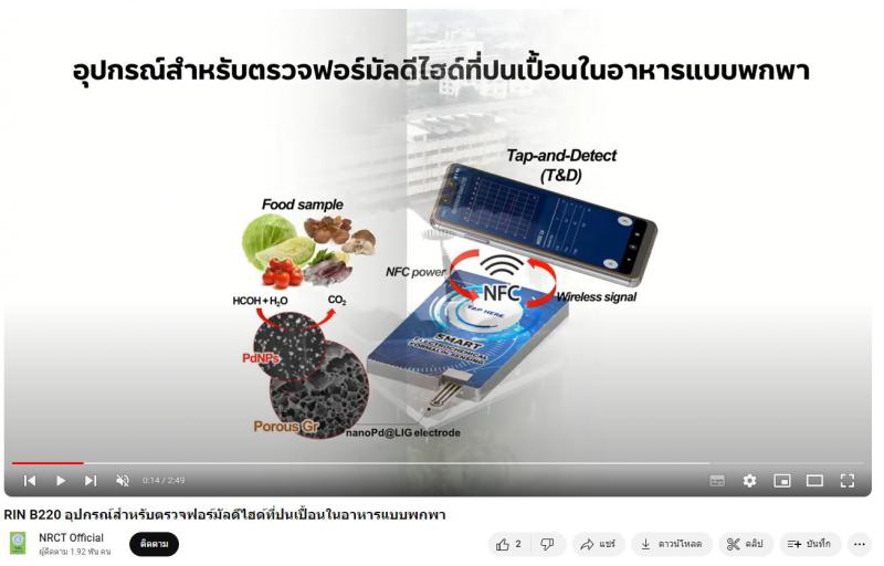 - ผลงานสายนวัตกรรมอุดมศึกษา ประจำปี 2565 ด้านการสาธารณสุข สุขภาพ และเทคโนโลยีทางการแพทย์: อุปกรณ์สำหรับตรวจฟอร์มัลดีไฮด์ที่ปนเปื้อนในอาหารแบบพกพา