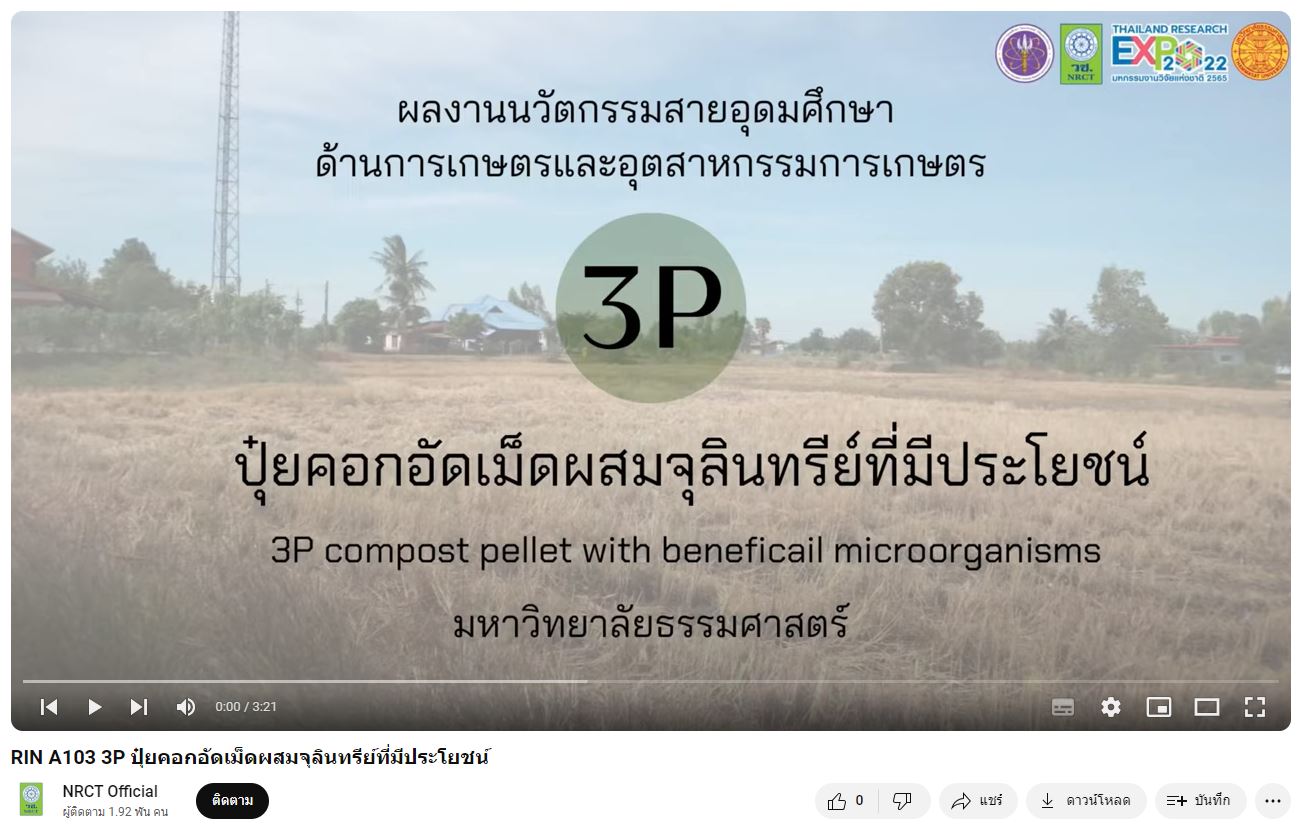 - ผลงานสายนวัตกรรมอุดมศึกษา ประจำปี 2565 ด้านการเกษตรและอุตสาหกรรม: ปุ๋ยคอกอัดเม็ดผสมจุลินทรีย์ที่มีประโยชน์