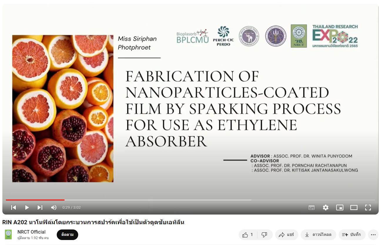 - ผลงานสายนวัตกรรมอุดมศึกษา ประจำปี 2565 ด้านการเกษตรและอุตสาหกรรม: นาโนฟิล์มโดยกระบวนการสปาร์คเพื่อใช้เป็นตัวดูดซับเอทิลีน