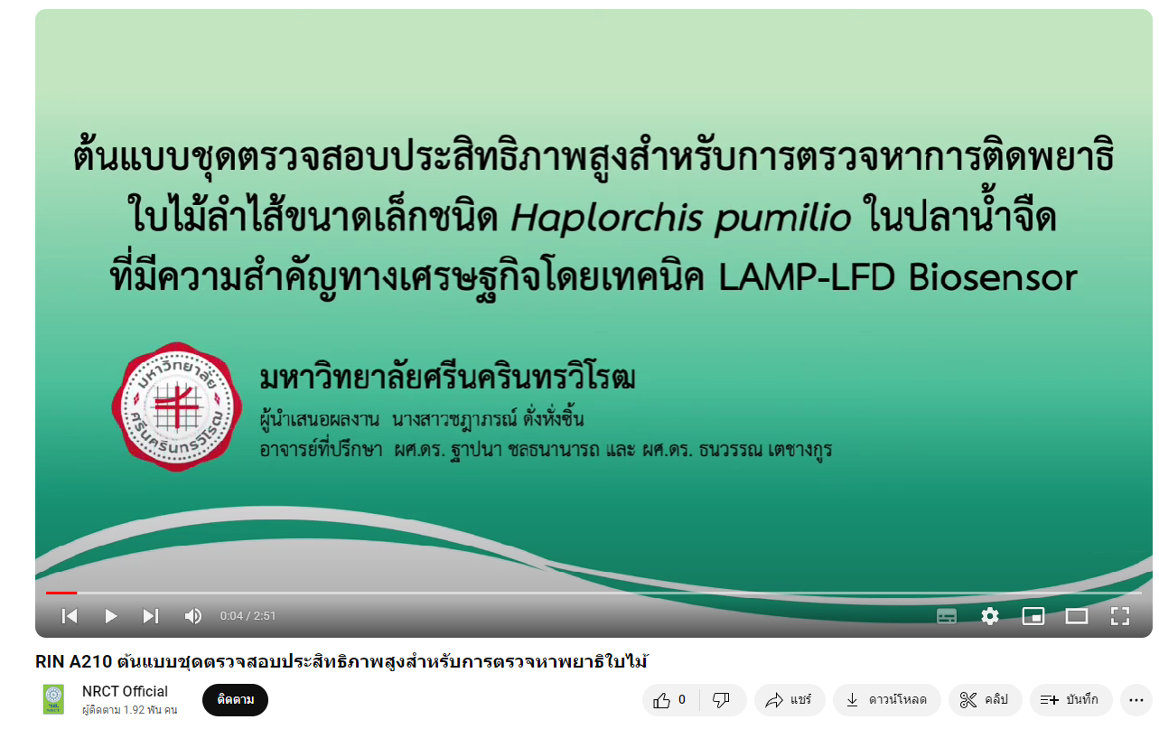 - ต้นแบบชุดตรวจสอบประสิทธิภาพสูงสำหรับการตรวจหาการติดพยาธิใบไม้ลำไสขนาดเล็กชนิด Haplorhis puilio ในปลาน้ำจืด ที่มีความสำคัญทางเศรษฐกิจโดยเทคนิค LAMP-LFD Biosensor
