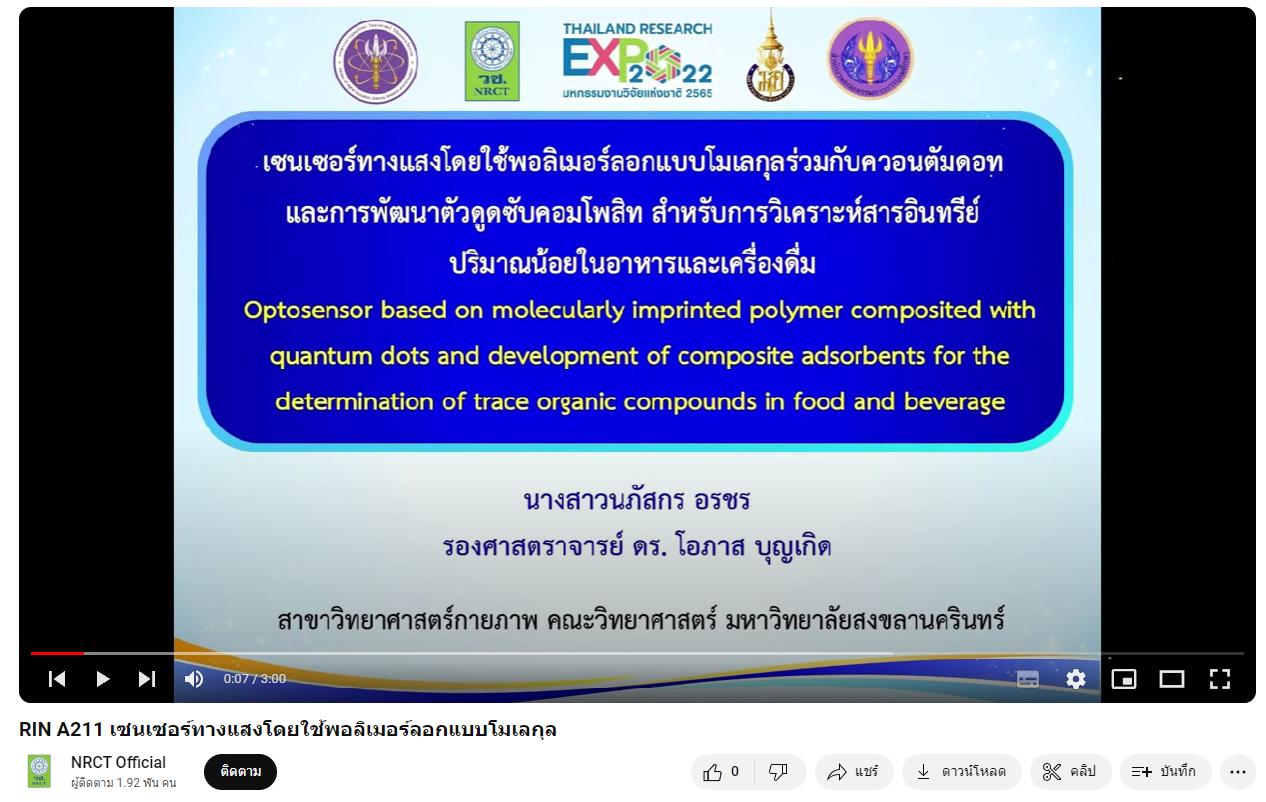- เซนเซอร์ทางแสงโดยใช้พอลิเมอร์ลอกแบบโมเลกุลร่วมกับควอนตัมดอทและการพัฒนาตัวดูดซับคอมโพสิท สำหรับการวิเคราะห์สารอินทรีย์ปริมาณน้อยในอาหารและเครื่องดื่ม