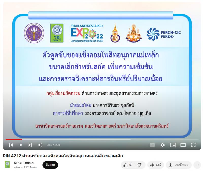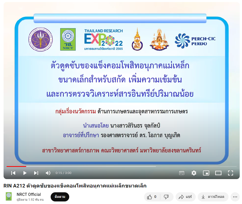 - ผลงานสายนวัตกรรมอุดมศึกษา ประจำปี 2565 ด้านการเกษตรและอุตสาหกรรม: ตัวดูดซับของแข็งคอมโพสิทอนุภาคแม่เหล็กขนาดเล็ก
