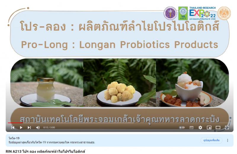 - ผลงานสายนวัตกรรมอุดมศึกษา ประจำปี 2565 ด้านการเกษตรและอุตสาหกรรม: โปร ลอง ผลิตภัณฑ์ลำไยโปรไบโอติกส์