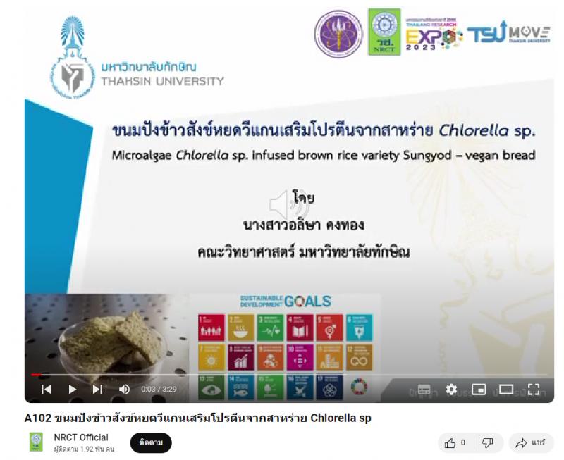 - ผลงานสายนวัตกรรมอุดมศึกษา ประจำปี 2566 ด้านการเกษตรและอุตสาหกรรมการเกษตร: ขนมปังข้าวสังข์หยดวีแกนเสริมโปรตีนจากสาหร่าย Chlorella sp