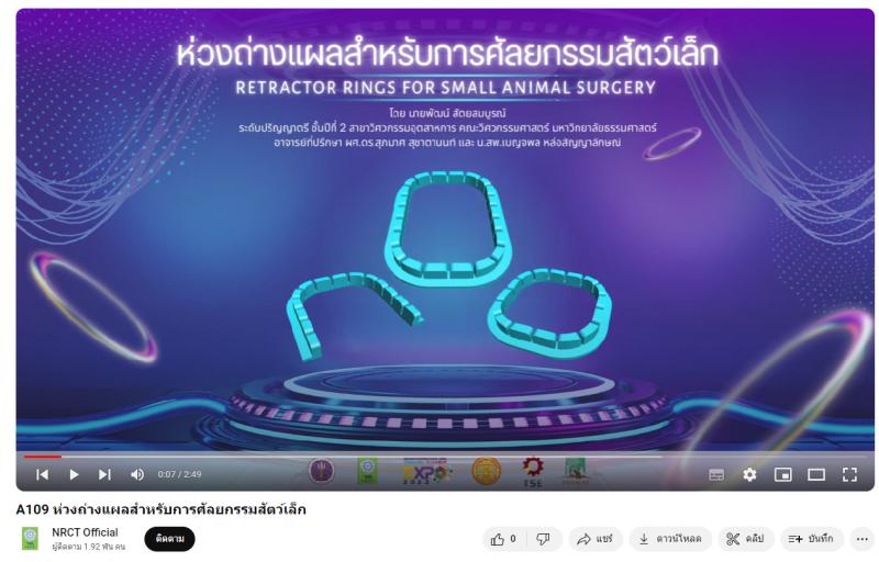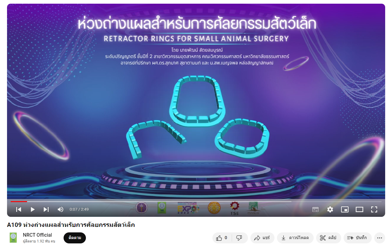 - ผลงานสายนวัตกรรมอุดมศึกษา ประจำปี 2566 ด้านการเกษตรและอุตสาหกรรมการเกษตร: ห่วงถ่างแผลสำหรับการศัลยกรรมสัตว์เล็ก