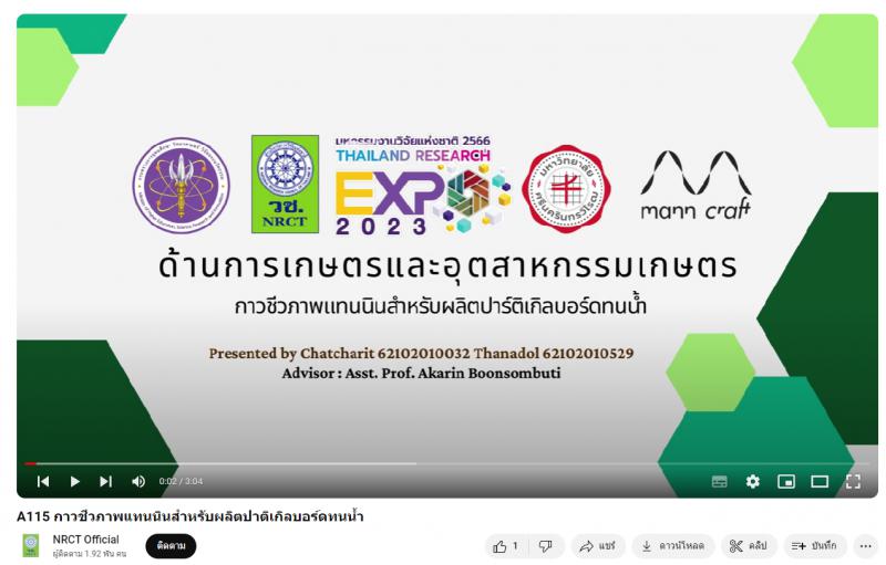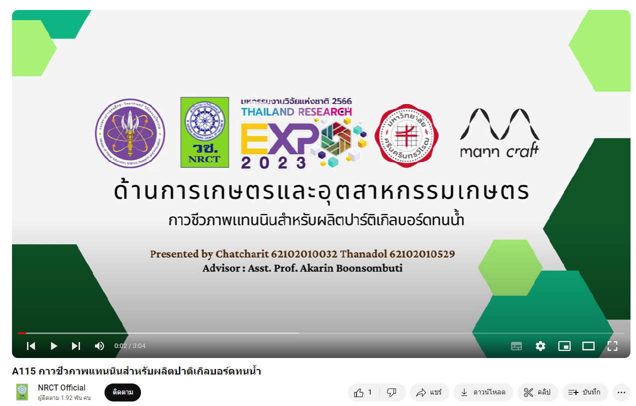 - ผลงานสายนวัตกรรมอุดมศึกษา ประจำปี 2566 ด้านการเกษตรและอุตสาหกรรมการเกษตร: กาวชีวภาพแทนนินสำหรับผลิตปาติเกิลบอร์ดทนน้ำ