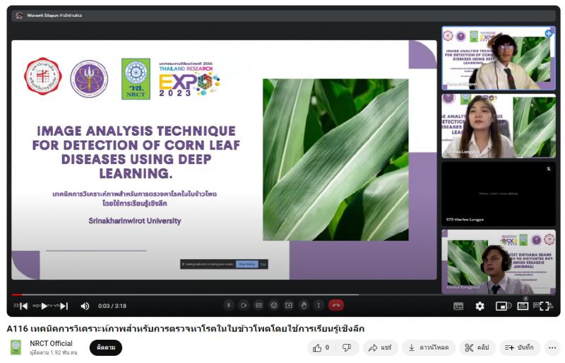- ผลงานสายนวัตกรรมอุดมศึกษา ประจำปี 2566 ด้านการเกษตรและอุตสาหกรรมการเกษตร: เทคนิคการวิเคราะห์ภาพสำหรับการตรวจหาโรคในใบข้าวโพดโดยใช้การเรียนรู้เชิงลึก