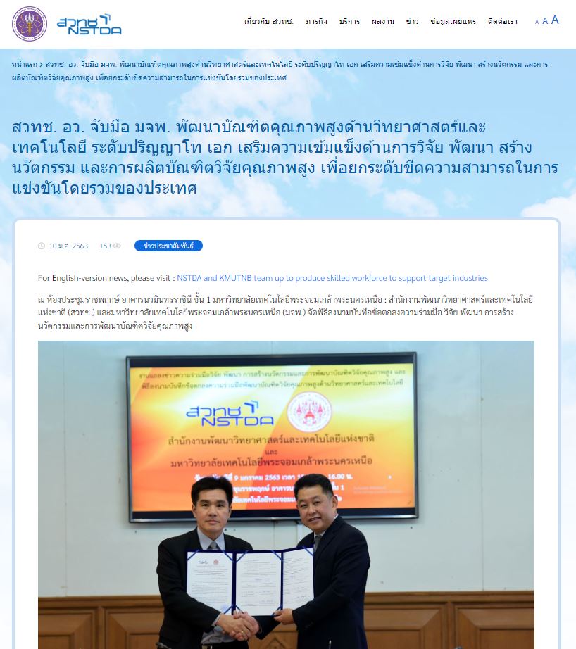 - สำนักงานพัฒนาวิทยาศาสตร์และเทคโนโลยีแห่งชาติ (สวทช.) และมหาวิทยาลัยเทคโนโลยีพระจอมเกล้าพระนครเหนือ (มจพ.) จัดพิธีลงนามบันทึกข้อตกลงความร่วมมือ วิจัย พัฒนา การสร้างนวัตกรรมและการพัฒนาบัณฑิตวิจัยคุณภาพสูง เพื่อมุ่งเน้นการทำงานวิจัย พัฒนา สร้างนวัตกรรม และการผลิตบัณฑิตวิจัยคุณภาพสูง ร่วมกับ สวทช. เพื่อยกระดับขีดความสามารถในการแข่งขันโดยรวมของประเทศ