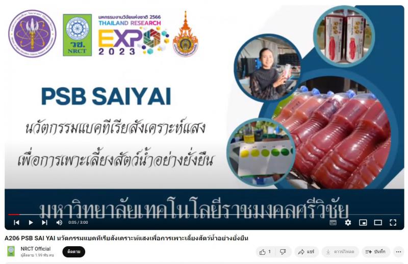 - ผลงานสายนวัตกรรมอุดมศึกษา ประจำปี 2566 ด้านการเกษตรและอุตสาหกรรมการเกษตร: PSB SAI YAI นวัตกรรมแบคทีเรียสังเคราะห์แสงเพื่อการเพาะเลี้ยงสัตว์น้ำอย่างยั่งยืน