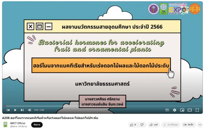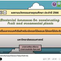 - ผลงานสายนวัตกรรมอุดมศึกษา ประจำปี 2566 ด้านการเกษตรและอุตสาหกรรมการเกษตร: ฮอร์โมนจากแบคทีเรียสำหรับเร่งดอกไม้ผลและไม้ดอกไม้ประดับ