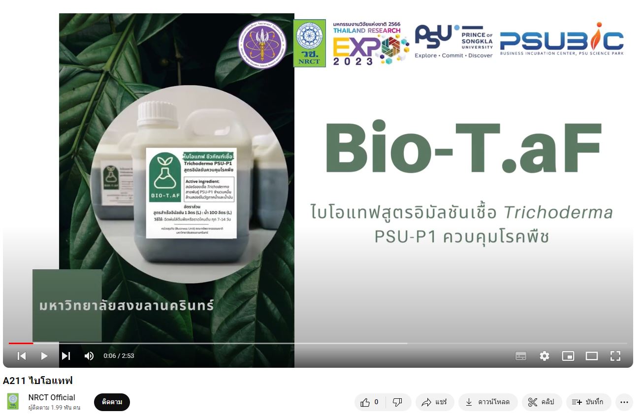 - Bio-T.aF ไบโอแทฟสูตรอิมัลชันเชื้อ Trichoderma PSU-P1 ควบคุมโรคพืช