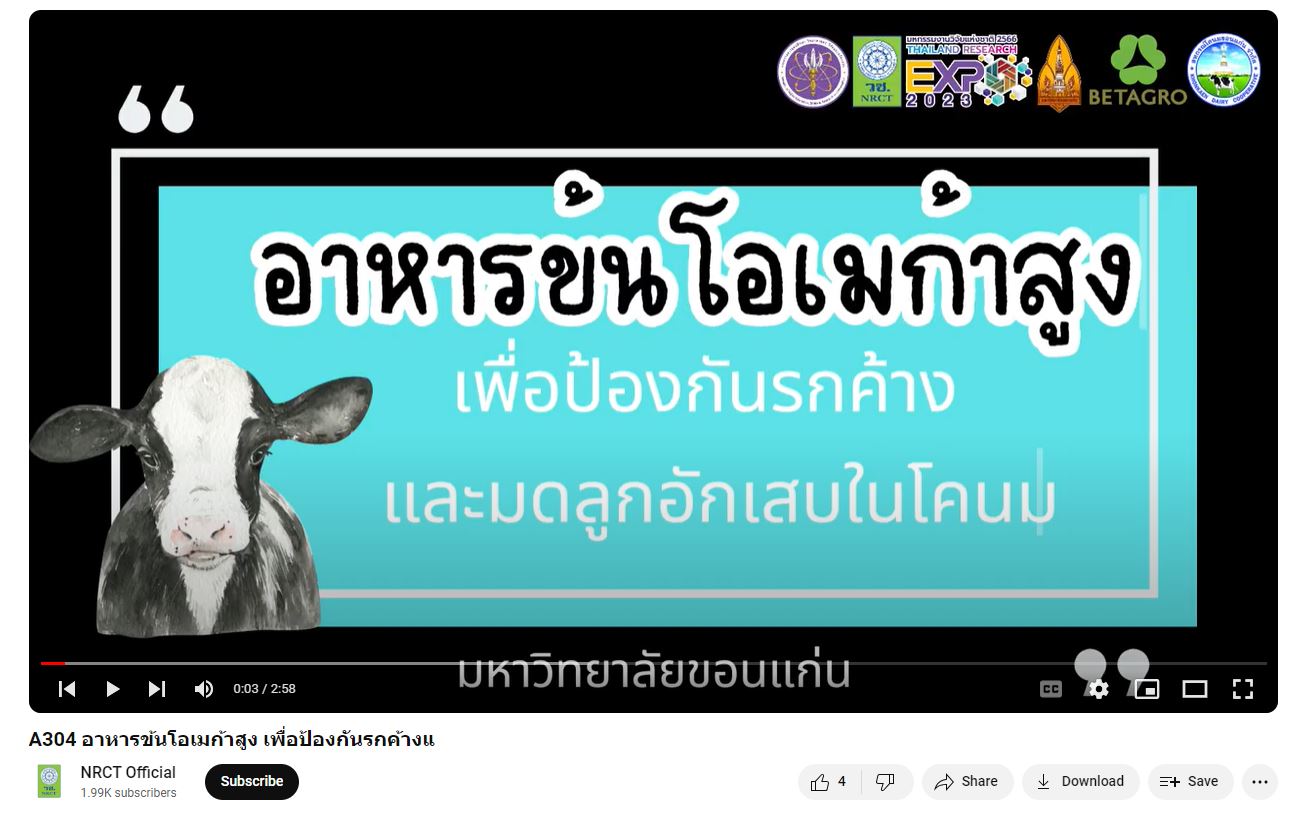 - ผลงานสายนวัตกรรมอุดมศึกษา ประจำปี 2566 ด้านการเกษตรและอุตสาหกรรมการเกษตร: อาหารข้นโอเมก้าสูง เพื่อป้องกันรกค้างและมดลูกอักเสบในโคนม