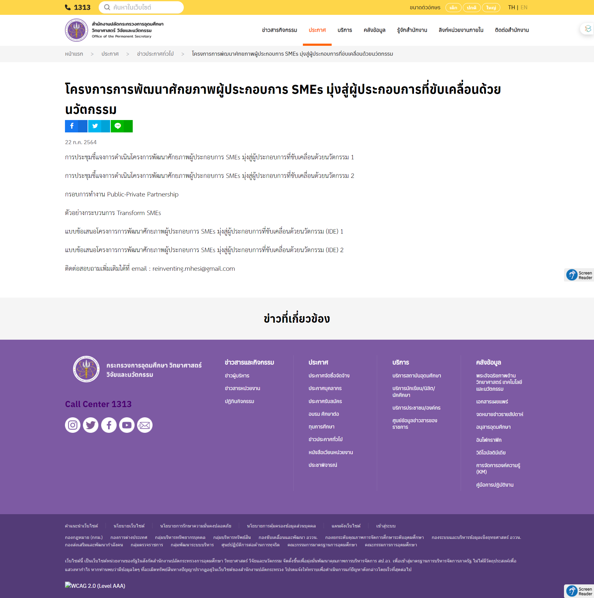 - เอกสารประกอบการประชุมโครงการการพัฒนาศักยภาพผู้ประกอบการ SMEs มุ่งสู่ผู้ประกอบการที่ขับเคลื่อนด้วยนวัตกรรม ประกอบด้วย (1) การประชุมชี้แจงการดำเนินโครงการพัฒนาศักยภาพผู้ประกอบการ SMEs มุ่งสู่ผู้ประกอบการที่ขับเคลื่อนด้วยนวัตกรรม 1 (2) การประชุมชี้แจงการดำเนินโครงการพัฒนาศักยภาพผู้ประกอบการ SMEs มุ่งสู่ผู้ประกอบการที่ขับเคลื่อนด้วยนวัตกรรม 2 (3) กรอบการทำงาน Public-Private Partnership (4) ตัวอย่างกระบวนการ Transform SMEs (5) แบบข้อเสนอโครงการการพัฒนาศักยภาพผู้ประกอบการ SMEs มุ่งสู่ผู้ประกอบการที่ขับเคลื่อนด้วยนวัตกรรม (IDE) 1 (6) แบบข้อเสนอโครงการการพัฒนาศักยภาพผู้ประกอบการ SMEs มุ่งสู่ผู้ประกอบการที่ขับเคลื่อนด้วยนวัตกรรม (IDE) 2