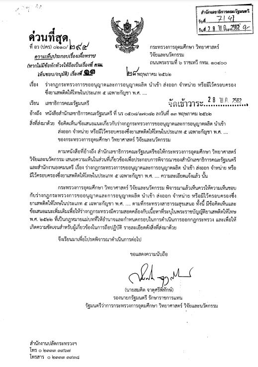 ร่างกฎกระทรวงการขออนุญาตและการอนุญาตผลิต นำเข้า ส่งออก จำหน่าย หรือมีไว้ในครอบครองซึ่งยาเสพติดให้โทษในประเภท 5 เฉพาะกัญชา พ.ศ. ....
