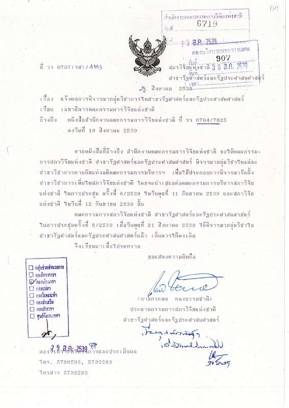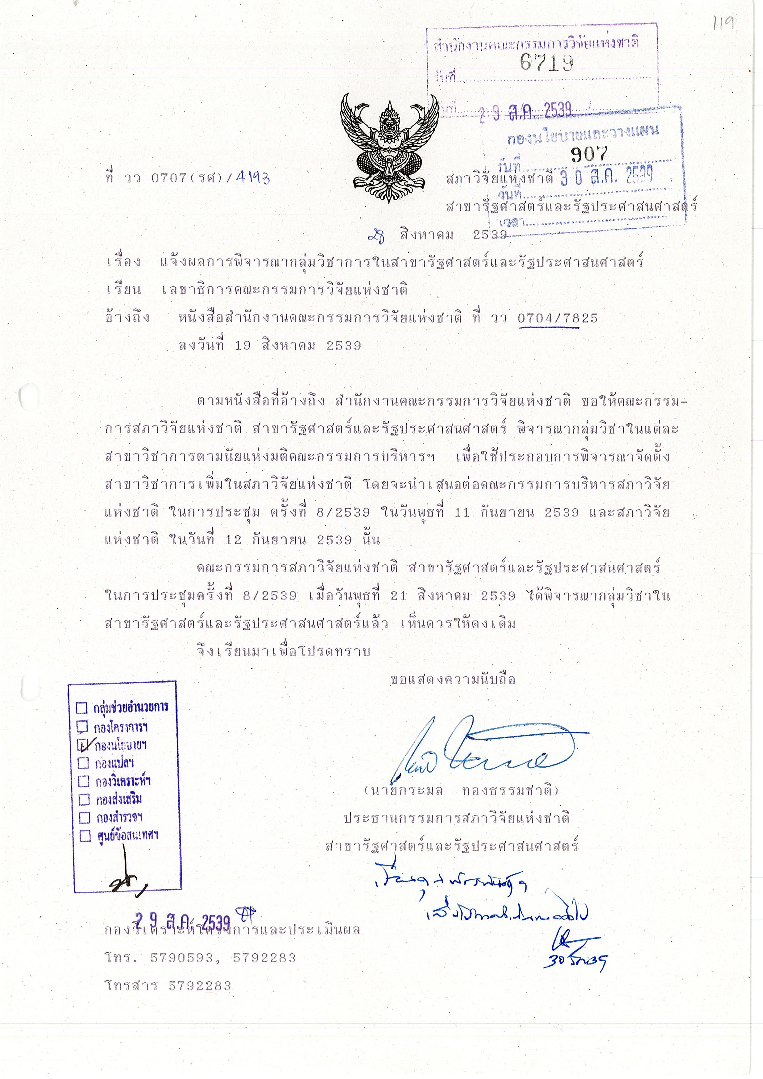 แจ้งผลการพิจารณากลุ่มวิชาการในสาขารัฐศาสตร์และรัฐประศาสนศาสตร์