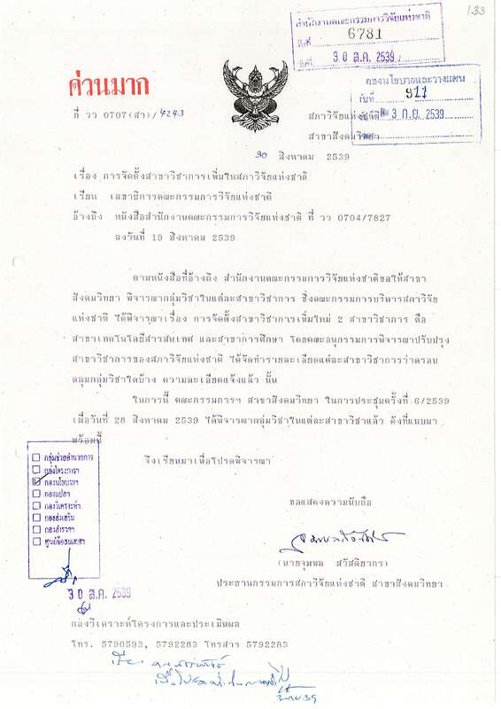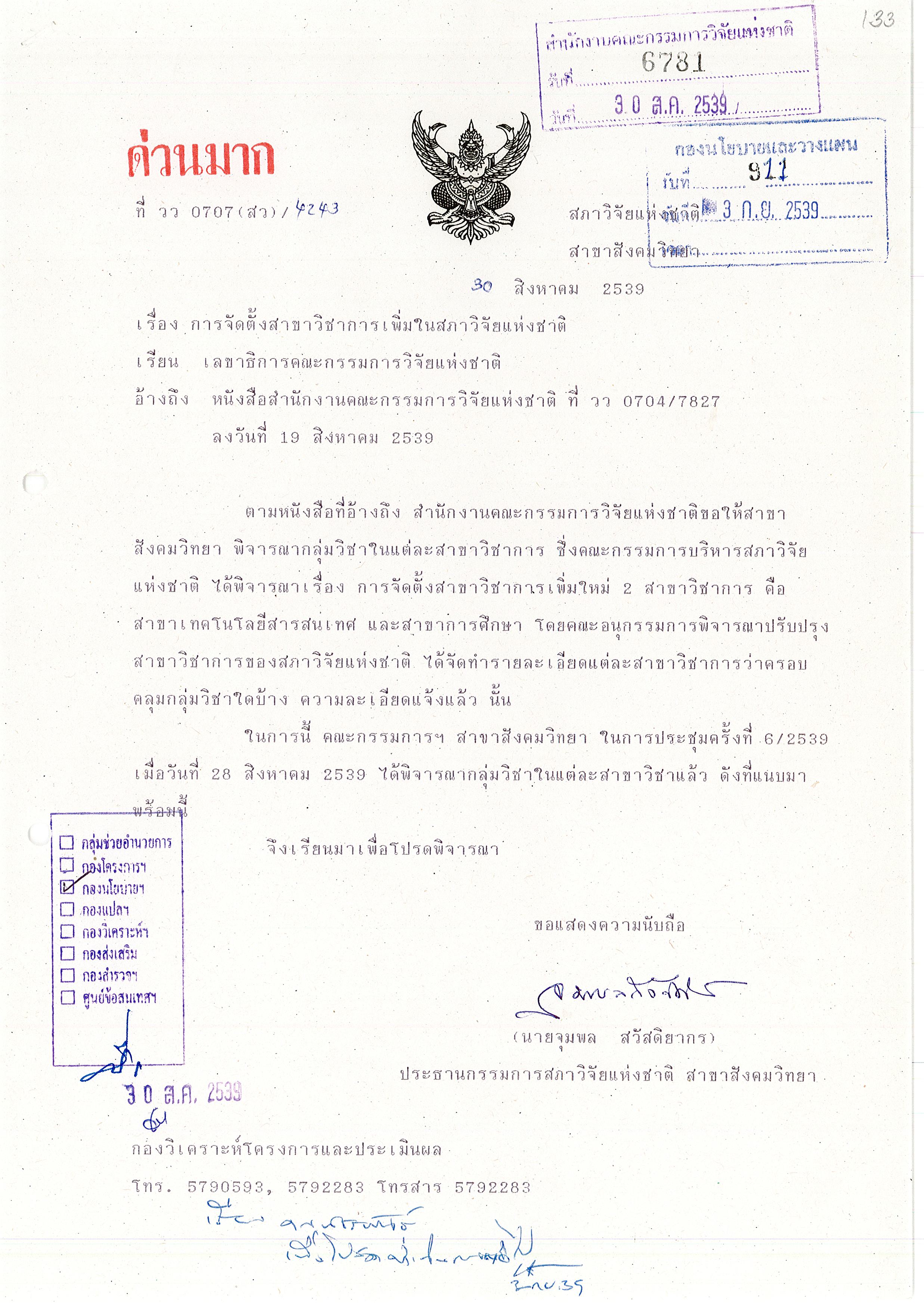 - การจัดตั้งสาขาวิชาการเพิ่มในสภาวิจัยแห่งชาติ