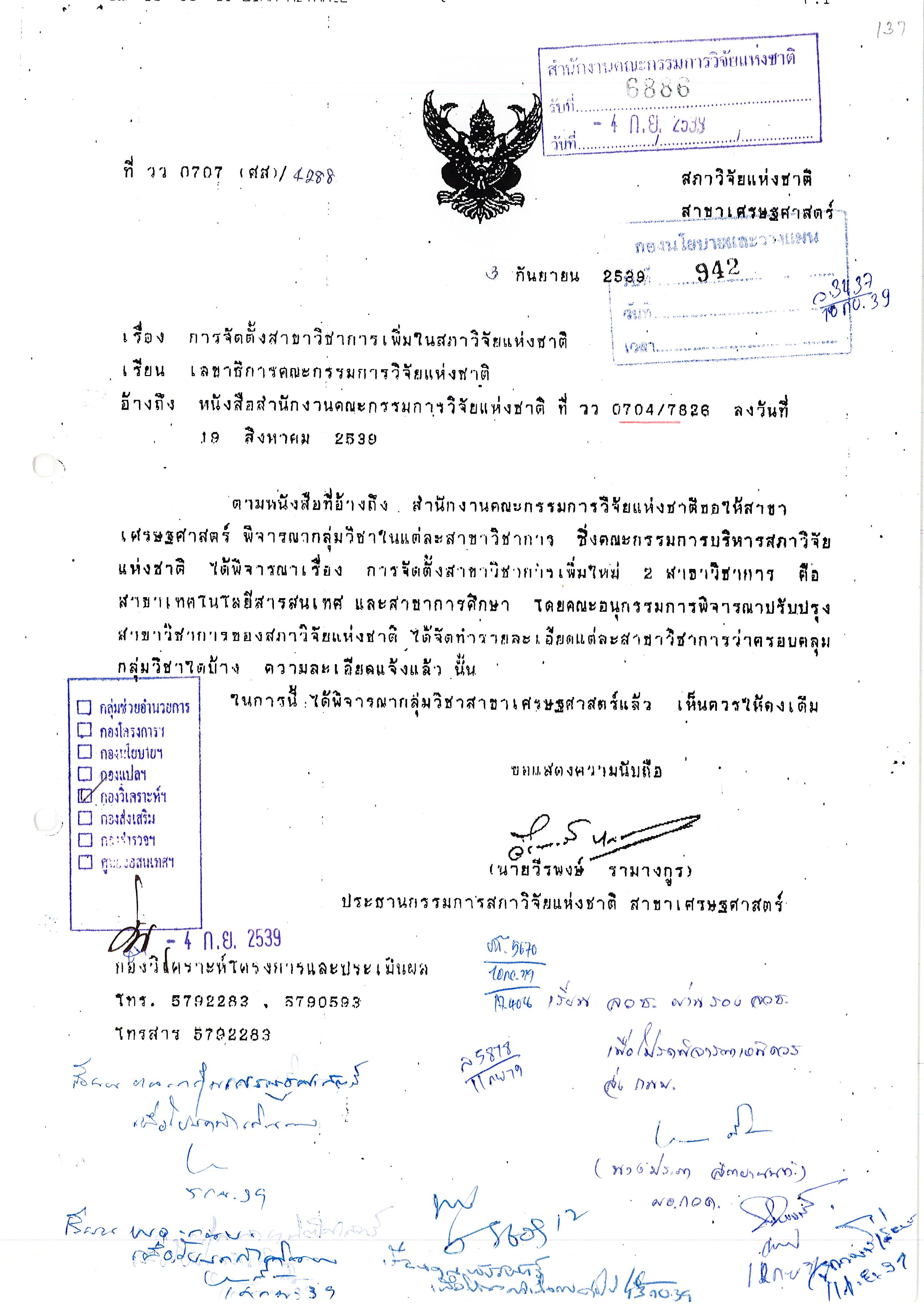 - การจัดตั้งสาขาวิชาการเพิ่มในสภาวิจัยแห่งชาติ