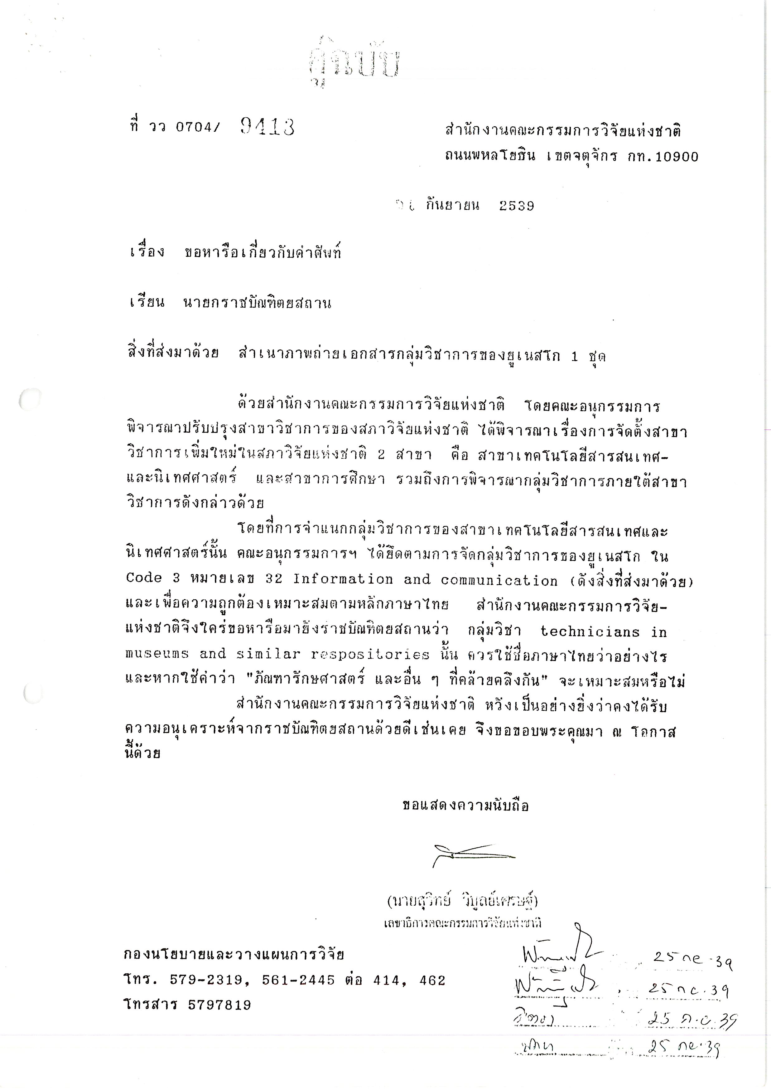 - คู่ฉบับ หนังสือเลขที่ วว 0704/ 9413 วันที่ 25 กันยายน 2539 เรื่อง ขอหารือเกี่ยวกับคำศัพท์