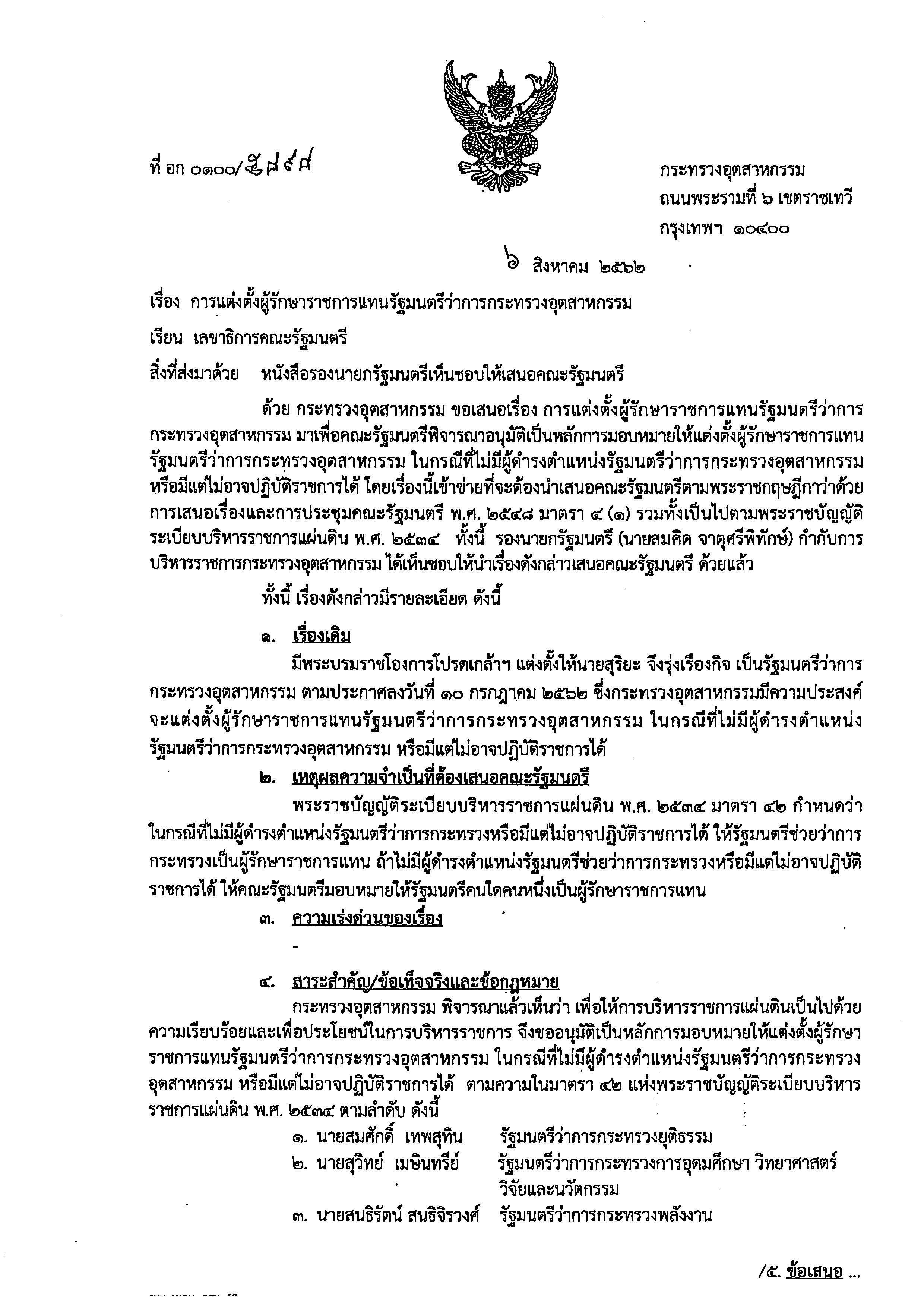 การแต่งตั้งผู้รักษาราชการแทนรัฐมนตรีว่าการกระทรวงอุตสาหกรรม