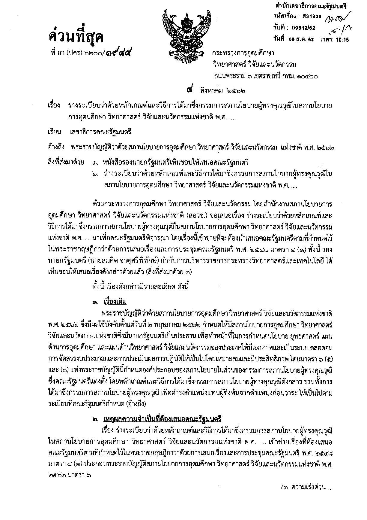 - ร่างระเบียบหลักเกณฑ์และวิธีการได้มาซึ่งกรรมการสภานโยบายผู้ทรงคุณวุฒิในสภานโยบายการอุดมศึกษา วิทยาศาสตร์ วิจัยและนวัตกรรมแห่งชาติ