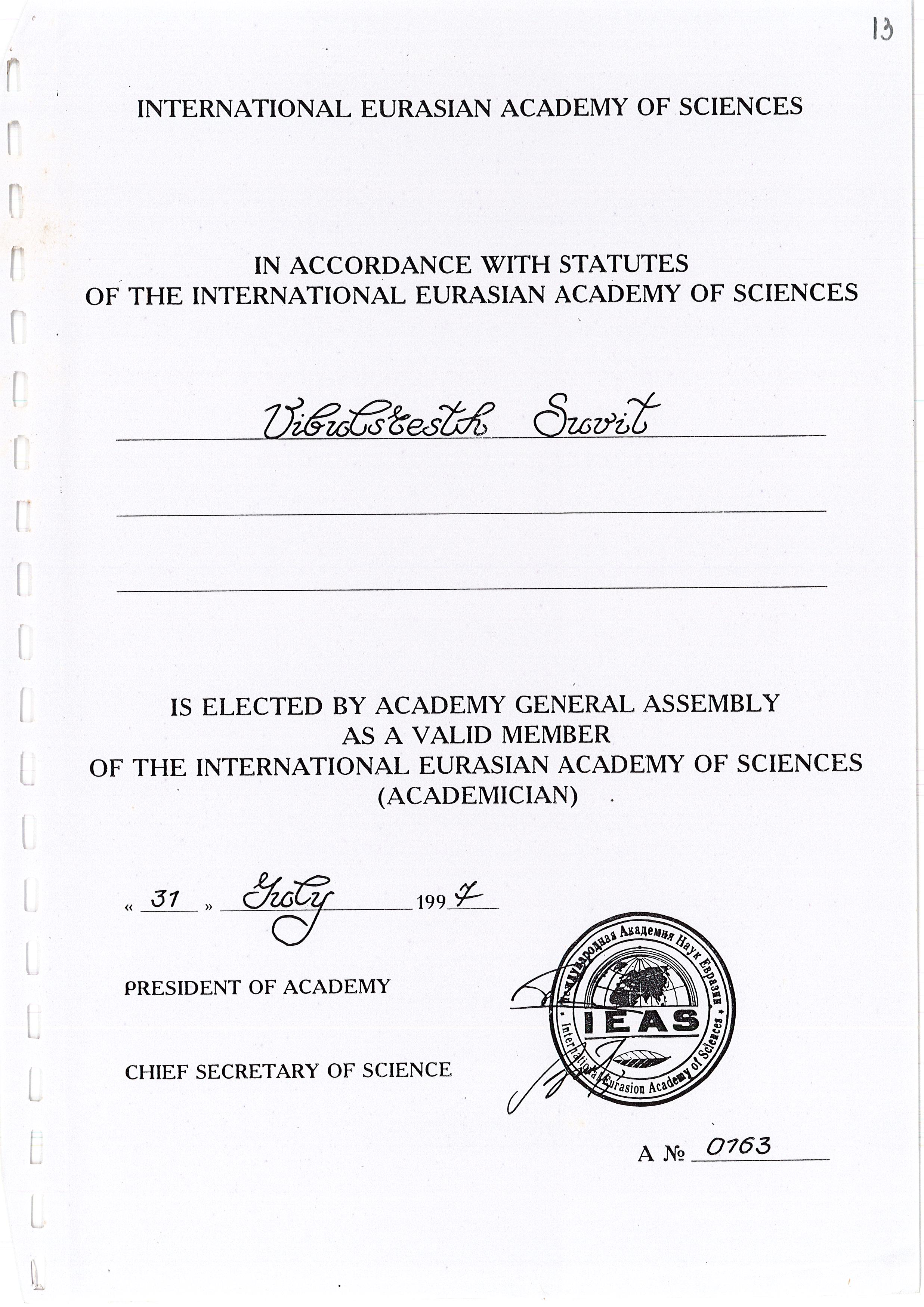 International Eurasian Academy of Sciences in Accodance with Statutes of the International Eurasian Academy of Sciences Vibulresth Suvit is elected by Academy General Assembly as a valid member of the International Eurasian Academy of Sciences (Academician)
