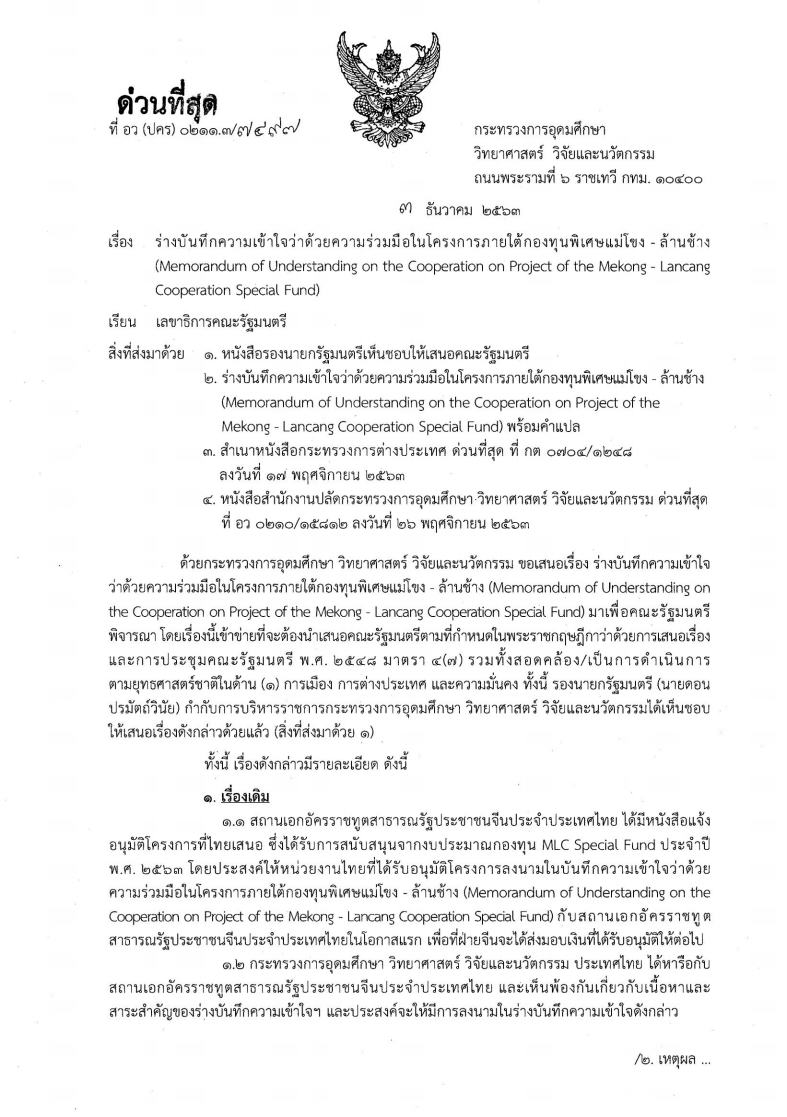 - หนังสือราชการที่ อว(ปคร)0211/7497 ลงวันที่ 3 ธันวาคม 2563 กล่าวถึง กระทรวงการอุดมศึกษา วิทยาศาสตร์ วิจัยและนวัตกรรม เสนอต่อคณะรัฐมนตรี เกี่ยวกับร่างบันทึกความเข้าใจว่าด้วยความร่วมมือในโครงการภายใต้กองทุนพิเศษแม่โขง-ล้านช้าง (Memorandum of Understanding on the Cooperation on Project of the Mekong-Lancang Cooperation Special Fund) โดยคณะรัฐมนตรีมีมติ 1. เห็นชอบร่างบันทึกความเข้าใจว่าด้วยความร่วมมือในโครงการภายใต้กองทุนพิเศษแม่โขง-ล้านช้าง (Memorandum of Understanding on the Cooperation on Project of the Mekong-Lancang Cooperation Special Fund) และอนุมัติให้ปลัดกระทรวงการอุดมศึกษา วิทยาศาสตร์ วิจัยและนวัตกรรม หรือผู้ที่ได้รับมอบหมาย เป็นผู้ลงนามในร่างบันทึกความเข้าใจฯ ซึ่งจะมีการลงนามในวันที่ 8 ธันวาคม 2563 ณ สถานเอกอัครราชทูตสาธารณรัฐประชาชนจีนประจำประเทศไทย โดยร่างบันทึกความเข้าใจฯ มีวัตถุประสงค์เพื่อกำหนดแนวทางในการบริหารจัดการงบประมาณที่ได้รับสนับสนุนจากงบประมาณกองทุน MLC Special Fund ประจำปี พ.ศ. 2563 จากสาธารณรัฐประชาชนจีน ให้เกิดประสิทธิภาพในการใช้กองทุนอย่างสูงสุด โดยกระทรวงการอุดมศึกษา วิทยาศาสตร์ วิจัยและนวัตกรรม ทำหน้าที่เป็นผู้ควบคุมดูแล ประเมินผลโครงการ ตามที่กระทรวงการอุดมศึกษา วิทยาศาสตร์ วิจัยและนวัตกรรมเสนอ ทั้งนี้ หากมีความจำเป็นต้องปรับเปลี่ยนร่างบันทึกความเข้าใจฯ ในส่วนที่ไม่ใช่สาระสำคัญและไม่ขัดกับหลักการที่คณะรัฐมนตรีได้ให้ความเห็นชอบไว้ ให้กระทรวงการอุดมศึกษา วิทยาศาสตร์ วิจัยและนวัตกรรมดำเนินการได้ โดยให้นำเสนอคณะรัฐมนตรีทราบภายหลัง พร้อมทั้งให้ชี้แจงเหตุผลและประโยชน์ที่ประเทศไทยได้รับจากการปรับเปลี่ยนดังกล่าวตามหลักเกณฑ์ของมติคณะรัฐมนตรีเมื่อวันที่ 30 มิถุนายน 2558 (เรื่อง การจัดทำหนังสือสัญญาเกี่ยวกับความสัมพันธ์ระหว่างประเทศหรือองค์การระหว่างประเทศ) 2. ให้กระทรวงการอุดมศึกษา วิทยาศาสตร์ วิจัยและนวัตกรรมรับความเห็นของกระทรวงการคลังและสำนักงบประมาณที่เห็นว่า ร่างบันทึกความเข้าใจฯ มีรายละเอียดเกี่ยวกับการส่งมอบงบประมาณและการบริหารจัดการ โดยเงินที่ส่วนราชการได้รับให้ดำเนินโครงการที่เกี่ยวข้องกับความร่วมมือระหว่างประเทศสมาชิกลุ่มน้ำโขงของกองทุนพิเศษแม่โขง-ล้านช้างตามร่างบันทึกความเข้าใจฯ เป็นเงินที่หน่วยงานของรัฐได้รับตามโครงการช่วยเหลือ หรือร่วมมือกับรัฐบาลต่างประเทศ ซึ่งสามารถเก็บเงินไว้ใช้จ่ายได้โดยไม่ต้องนำส่งคลัง และถือปฏิบัติตามกฎหมาย หลักเกณฑ์และวิธีการที่กระทรวงการคลังกำหนด