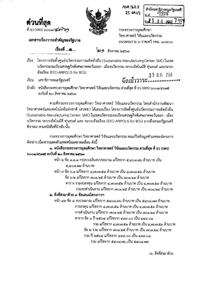 - หนังสือราชการที่ อว(ปคร)6001/4761 ลงวันที่ 21 สิงหาคม 2563 กล่าวถึง กระทรวงการอุดมศึกษา วิทยาศาสตร์ วิจัยและนวัตกรรม เสนอต่อคณะรัฐมนตรี เกี่ยวกับโครงการจัดตั้งศูนย์นวัตกรรมการผลิตยั่งยืน (Sustainable Manufacturing Center: SMC) ในเขตนวัตกรรมระเบียงเศรษฐกิจพิเศษภาคตะวันออก : เมืองนวัตกรรม ระบบอัตโนมัติ หุ่นยนต์ และระบบอัจฉริยะ (EECi-ARIPOLIS for BCG) โดยอ้างถึงหนังสือกระทรวงการอุดมศึกษา วิทยาศาสตร์ วิจัยและนวัตกรรม ด่วนที่สุด ที่อว(ปคร)6001/4675 ลงวันที่ 20 สิงหาคม 2563 เรื่องการขอแก้ไขข้อมูลตัวเลขของโครงการ เนื่องจากแสดงตัวเลขทศนิยมคลาดเคลื่อน