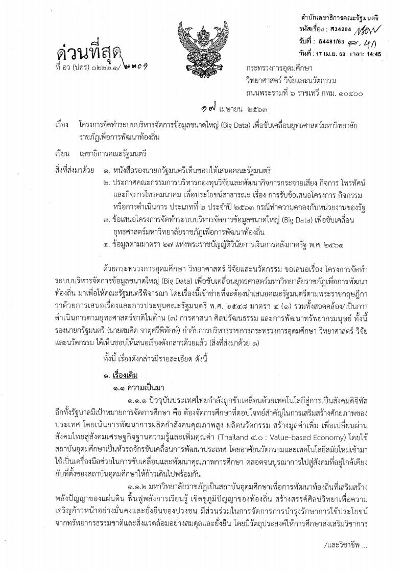 - หนังสือราชการที่ อว(ปคร)0222.1/2301 ลงวันที่ 17 เมษายน 2563 กล่าวถึง กระทรวงการอุดมศึกษา วิทยาศาสตร์ วิจัยและนวัตกรรม เสนอต่อคณะรัฐมนตรี เกี่ยวกับโครงการจัดทำระบบบริหารจัดการข้อมูลขนาดใหญ่ (Big Data) เพื่อขับเคลื่อนยุทธศาสตร์มหาวิทยาลัยราชภัฏเพื่อการพัฒนาท้องถิ่น เพื่อการขอรับการสนับสนุนค่าใช้จ่ายการดำเนินโครงการดังกล่าว จากกองทุนวิจัยและพัฒนากิจการกระจายเสียง กิจการโทรทัศน์ และกิจการโทรคมนาคมเพื่อประโยชน์สาธารณะ ของสำนักงาน กสทช. ประจำปี พ.ศ. 2563 เป็นจำนวนเงิน 600,000,000 บาท (หกร้อยล้านบาทถ้วน)
