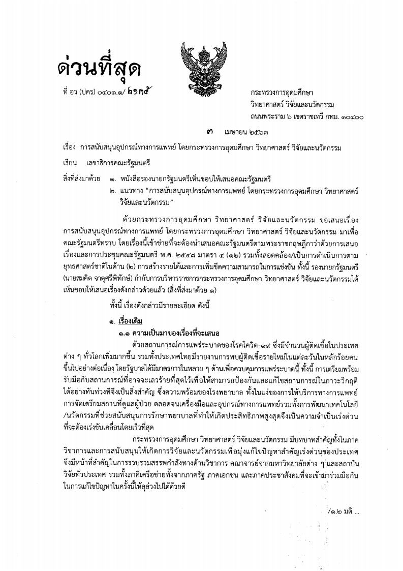 - หนังสือราชการที่ อว(ปคร)0401.1/2135 ลงวันที่ 3 เมษายน 2563 กล่าวถึง กระทรวงการอุดมศึกษา วิทยาศาสตร์ วิจัยและนวัตกรรม เสนอต่อคณะรัฐมนตรี เกี่ยวกับการสนับสนุนอุปกรณ์ทางการแพทย์ โดยกระทรวงการอุดมศึกษา วิทยาศาสตร์ วิจัยและนวัตกรรม โดยคณะรัฐมนตรีมีมติรับทราบการดำเนินงานรองรับสถานการณ์การระบาดของโรคโควิด-19 ของกระทรวงการอุดมศึกษา วิทยาศาสตร์ วิจัยและนวัตกรรม ในประเด็น “การสนับสนุนอุปกรณ์ทางการแพทย์” โดยกระทรวงการอุดมศึกษา วิทยาศาสตร์ วิจัยและนวัตกรรม ได้ดำเนินการร่วมกับหน่วยงานในสังกัด มหาวิทยาลัย ตลอดจนภาคเอกชน เพื่อรองรับสถานการณ์การระบาดของโรคโควิด-19 โดยมุ่งเน้นประเด็นการสนับสนุนอุปกรณ์ทางการแพทย์ 4 ประเด็น คือ 1. หน้ากากทดแทน N95 (N95-equivalent) ที่สามารถใช้ได้หลายครั้ง 2. อุปกรณ์ป้องกันภัยส่วนบุคคล (Personal Protective Equipment : PPE) 3. เครื่องช่วยหายใจ (Ventilators) และ 4. ห้องตรวจแยกโรคแรงดันลบ (Negative-pressure facilities) ตามที่กระทรวงการอุดมศึกษา วิทยาศาสตร์ วิจัยและนวัตกรรมเสนอ