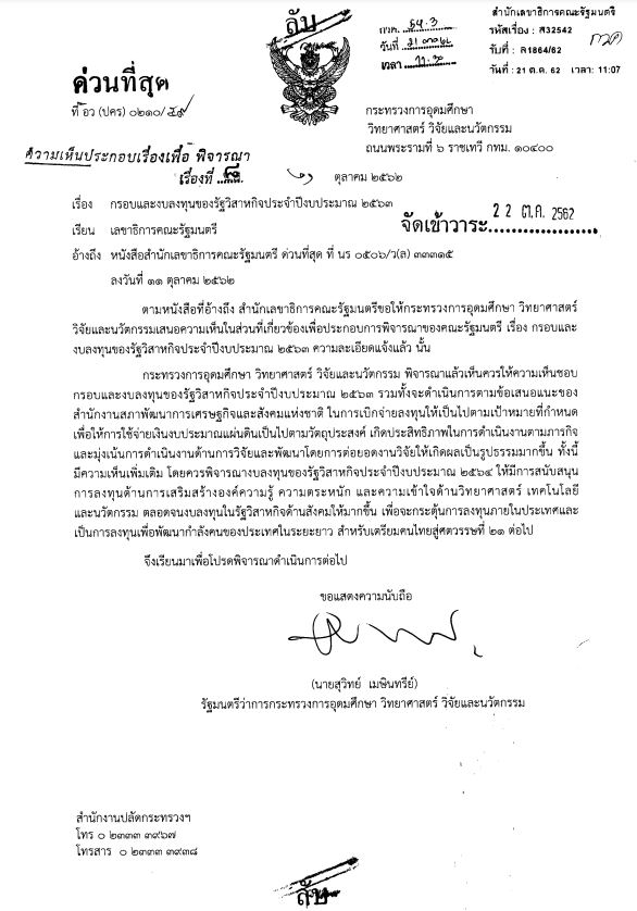 - กระทรวงการอุดมศึกษา วิทยาศาสตร์ วิจัยและนวัตกรรม พิจารณาให้ความเห็นชอบ กรอบและงบลงทุนของรัฐวิสาหกิจประจำปีงบประมาณ 2563 รวมทั้งจะดำเนินการตามช้อเสนอแนะของสำนักงานสภาพัฒนาการเศรษฐกิจและสังคมแห่งชาติ ในการเบิกจ่ายลงทุนให้เป็นไปตามเป้าหมายที่กำหนด เพื่อให้การใช้จ่ายเงินงบประมาณแผ่นดินเป็นไปตามวัตถุประสงค์ เกิดประสิทธิภาพในการดำเนินงานตามภารกิจ และมุ่งเน้นการดำเนินงานด้านการวิจัยและพัฒนาโดยการต่อยอดงานวิจัยให้เกิดผลเป็นรูปธรรมมากขึ้น ทั้งนี้ มีความเห็นเพิ่มเติม โดยควรพิจารณางบลงทุนของรัฐวิสาหกิจประจำปีงบประมาณ 2564 ให้มีการสนับสนุนการลงทุนต้านการเสริมสร้างองค์ความรู้ ความตระหนัก และความเข้าใจด้านวิทยาศาสตร์ เทคโนโลยี และนวัตกรรม ตลอดจนงบลงทุนในรัฐวิสาหกิจต้านสังคมให้มากขึ้น เพื่อจะกระตุ้นการลงทุนภายในประเทศและเป็นการลงทุนเพื่อพัฒนากำลังคนของประเทศในระยะยาว สำหรับเตรียมคนไทยสู่ศตวรรษที่ 21 ต่อไป