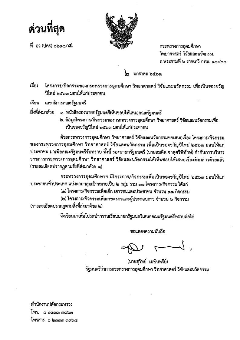 - หนังสือราชการที่ อว(ปคร)0210/4 ลงวันที่ 2 มกราคม 2563 กล่าวถึง กระทรวงการอุดมศึกษา วิทยาศาสตร์ วิจัยและนวัตกรรม เสนอต่อคณะรัฐมนตรี เกี่ยวกับโครงการ/กิจกรรมของกระทรวงการอุดมศึกษา วิทยาศาสตร์ วิจัยและนวัตกรรม เพื่อเป็นของขวัญปีใหม่ 2563 มอบให้แก่ประชาชน โดยคณะรัฐมนตรีมีมติรับทราบโครงการ/กิจกรรมของกระทรวงการอุดมศึกษา วิทยาศาสตร์ วิจัยและนวัตกรรม เพื่อเป็นของขวัญปีใหม่ 2563 มอบให้แก่ประชาชนทั่วประเทศ แบ่งตามกลุ่มเป้าหมายเป็น 2 กลุ่ม รวม 17 โครงการ/กิจกรรม ได้แก่ 1) โครงการ/กิจกรรมเพื่อเด็ก เยาวชนและประชาชน จำนวน 11 กิจกรรม และ 2) โครงการ/กิจกรรมเพื่อเกษตรกรและผู้ประกอบการ จำนวน 6 กิจกรรม