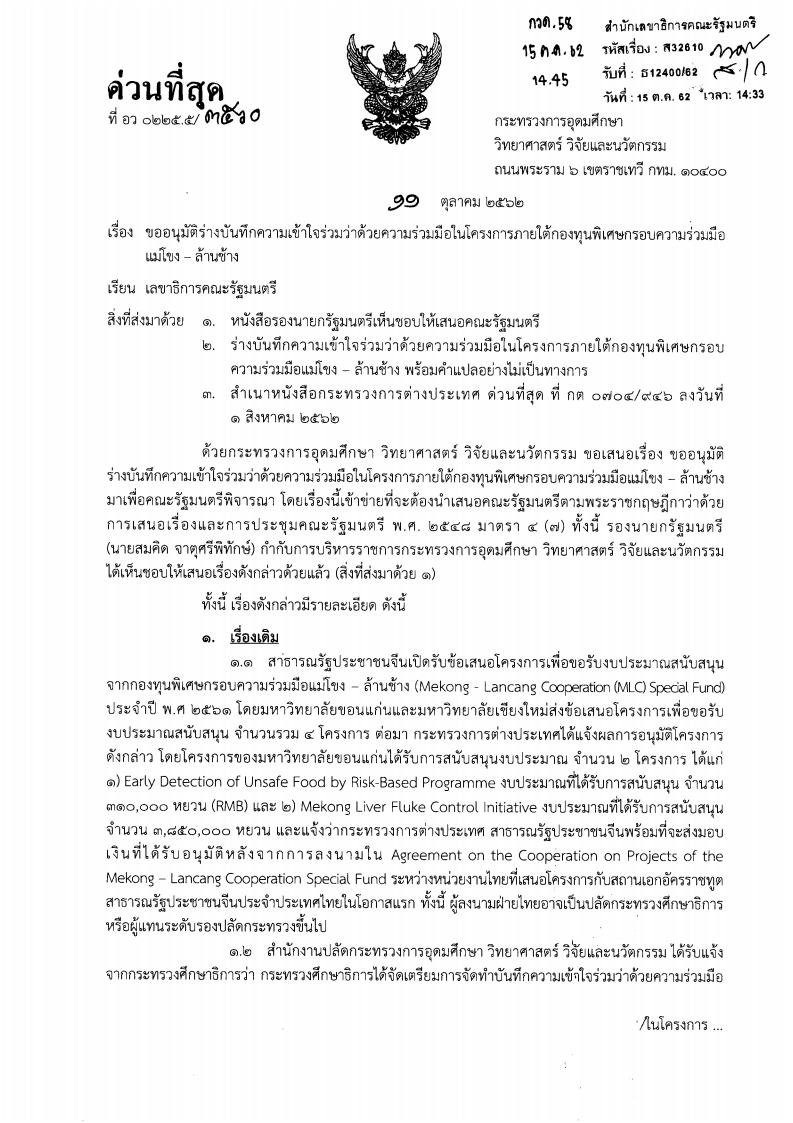- หนังสือราชการที่ อว(ปคร)0225.5/3560 ลงวันที่ 11 ตุลาคม 2562 กล่าวถึง กระทรวงการอุดมศึกษา วิทยาศาสตร์ วิจัยและนวัตกรรม เสนอต่อคณะรัฐมนตรี เกี่ยวกับการขออนุมัติร่างบันทึกความเข้าใจร่วมว่าด้วยความร่วมมือในโครงการภายใต้กองทุนพิเศษกรอบความร่วมมือแม่โขง – ล้านช้าง โดยคณะรัฐมนตรีมีมติ 1. เห็นชอบร่างบันทึกความเข้าใจว่าด้วยความร่วมมือในโครงการภายใต้กองทุนพิเศษกรอบความร่วมมือแม่โขง-ล้านช้าง [Mekong-Lancang Cooperation (MLC) Special Fund] ซึ่งภายใต้บันทึกความเข้าใจฯ ระบุว่า จีนได้อนุมัติโครงการและสนับสนุนงบประมาณสำหรับดำเนินโครงการของกระทรวงการอุดมศึกษา วิทยาศาสตร์ วิจัยและนวัตกรรม (มหาวิทยาลัยขอนแก่น) จำนวน 2 โครงการ จำนวนเงิน 4,160,000 หยวน (ประมาณ 17,721,600 บาท) ได้แก่ 1) โครงการคัดกรองอาหารที่ไม่ปลอดภัยเบื้องต้นโดยอาศัยองค์ความรู้เรื่องการแยกแยะด้วยความเสี่ยง (Early detection of Unsafe Feed by risk) จำนวน 310,000 หยวน (ประมาณ 1,320,600 บาท) และ 2) โครงการนำร่องการควบคุมโรคพยาธิใบไม้ตับในประเทศลุ่มน้ำโขง (Mekong Liver Fluke Control Initiative) จำนวน 3,850,000 หยวน (ประมาณ 16,401,000 บาท) โดยฝ่ายจีนจะจัดสรรงบประมาณให้ฝ่ายไทยภายใน 20 วันทำการ หลังจากที่ได้มีการลงนาม โดยจะมีการลงนามระหว่างกระทรวงการอุดมศึกษา วิทยาศาสตร์ วิจัยและนวัตกรรม และสถานเอกอัครราชทูตสาธารณรัฐประชาชนจีนประจำประเทศไทย ภายในเดือนธันวาคม 2562 และอนุมัติให้ปลัดกระทรวงการอุดมศึกษา วิทยาศาสตร์ วิจัยและนวัตกรรม หรือผู้ที่ได้รับมอบหมายเป็นผู้ลงนามในร่างบันทึกความเข้าใจฯ