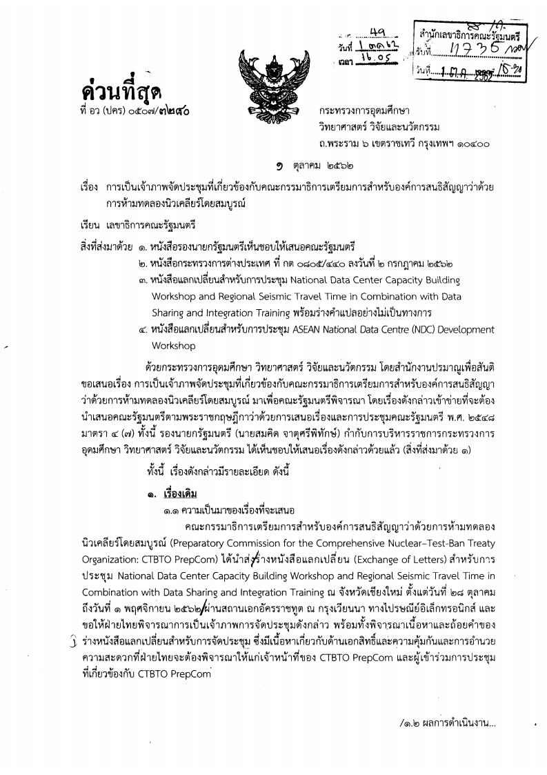 - หนังสือราชการที่ อว(ปคร)0507/3280 ลงวันที่ 1 ตุลาคม 2562 กล่าวถึง กระทรวงการอุดมศึกษา วิทยาศาสตร์ วิจัยและนวัตกรรม เสนอต่อคณะรัฐมนตรี เกี่ยวกับการเป็นเจ้าภาพจัดประชุมที่เกี่ยวข้องกับคณะกรรมาธิการเตรียมการสำหรับองค์การสนธิสัญญาว่าด้วยการห้ามทดลองนิวเคลียร์โดยสมบูรณ์ โดยคณะรัฐมนตรีมีมติ 1. เห็นชอบให้กระทรวงการอุดมศึกษา วิทยาศาสตร์ วิจัยและนวัตกรรม (สำนักงานปรมาณูเพื่อสันติ) ในฐานะตัวแทนของไทย ซึ่งเป็นสมาชิกของคณะกรรมาธิการเตรียมการสำหรับองค์การสนธิสัญญาว่าด้วยการห้ามทดลองอาวุธนิวเคลียร์โดยสมบูรณ์ (Preparatory Commission for the Comprehensive Nuclear-Test-Ban Treaty Organization : CTBTO PrepCom) ตอบรับการเป็นเจ้าภาพการจัดประชุมที่เกี่ยวข้องกับ CTBTO PrepCom ได้แก่ National Data Center Capacity Building Workshop and Regional Seismic Travel Time in Combination with Data Sharing and Integration Training ณ จังหวัดเชียงใหม่ ตั้งแต่วันที่ 28 ตุลาคม ถึงวันที่ 1 พฤศจิกายน 2562 ร่วมกับส่วนราชการที่เกี่ยวข้องตามหนังสือแลกเปลี่ยน 2. เห็นชอบหนังสือแลกเปลี่ยนสำหรับการประชุมดังกล่าวซึ่งมีเนื้อหาเกี่ยวกับด้านเอกสิทธิ์และความคุ้มกันและการอำนวยความสะดวกที่ฝ่ายไทยจะต้องพิจารณาให้แก่เจ้าหน้าที่ของ CTBTO PrepCom และผู้เข้าร่วมการประชุมที่เกี่ยวข้องกับ CTBTO PrepCom และ 3. อนุมัติให้เลขาธิการสำนักงานปรมาณูเพื่อสันติเป็นผู้ลงนามในหนังสือตอบรับการเป็นเจ้าภาพการประชุมดังกล่าวไปยัง CTBTO PtepCom