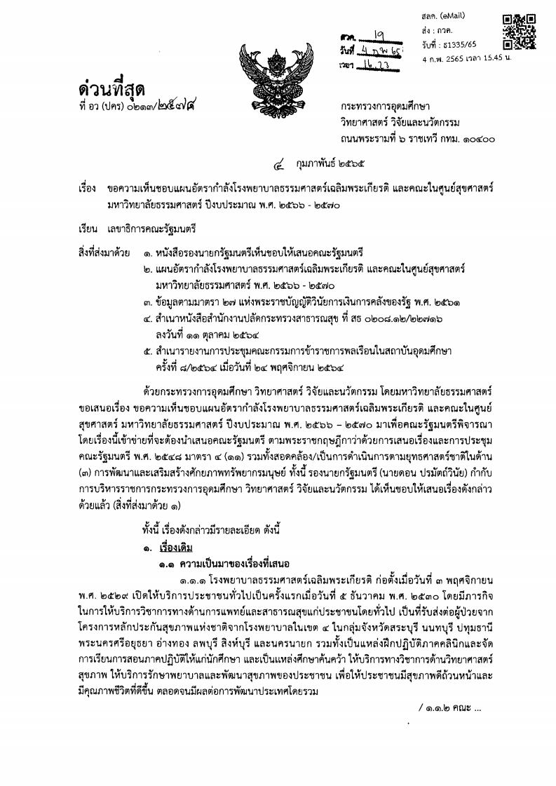 - หนังสือราชการที่ อว(ปคร)0213/2578 ลงวันที่ 4 กุมภาพันธ์ 2565 กล่าวถึง กระทรวงการอุดมศึกษา วิทยาศาสตร์ วิจัยและนวัตกรรม เสนอต่อคณะรัฐมนตรี เกี่ยวกับการขอความเห็นชอบแผนอัตรากำลังโรงพยาบาลธรรมศาสตร์เฉลิมพระเกียรติ และคณะในศูนย์สุขศาสตร์ มหาวิทยาลัยธรรมศาสตร์ ปีงบประมาณ พ.ศ. 2566 - 2570 โดยคณะรัฐมนตรีมีมติเห็นชอบแผนอัตรากำลังโรงพยาบาลธรรมศาสตร์เฉลิมพระเกียรติ และคณะในศูนย์สุขศาสตร์ มหาวิทยาลัยธรรมศาสตร์ ปีงบประมาณ พ.ศ. 2566 - 2570 จำนวน 1,058 อัตรา งบประมาณทั้งสิ้น 352,498,800 บาท (สามร้อยห้าสิบสองล้านสี่แสนเก้าหมื่นแปดพันแปดร้อยบาทถ้วน)