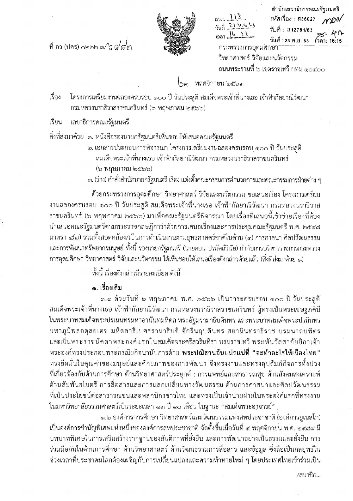 คณะรัฐมนตรีมีมติ ดังนี้ 1. เห็นชอบให้รัฐบาลเป็นเจ้าภาพจัดงานเฉลิมฉลองวาระครบรอบ 100 ปี วันประสูติ สมเด็จพระเจ้าพี่นางเธอ เจ้าฟ้ากัลยาณิวัฒนา กรมหลวงนราธิวาสราชนครินทร์ (6 พฤษภาคม 2566) โดยให้มีแผนการดำเนินงานและกิจกรรมการเฉลิมฉลองระหว่างปี พ.ศ. 2563-พ.ศ. 2566 และประสานความร่วมมือกับหน่วยงานภาครัฐ ภาคประชาชน ภาคเอกชน และมูลนิธิต่าง ๆ ในพระอุปถัมภ์ ร่วมจัดกิจกรรมตลอดปี พ.ศ. 2566 โดยไม่ขอผูกพันงบประมาณ เช่น การจัดประชุมวิชาการนานาชาติเพื่อสดุดีพระเกียรติคุณสมเด็จพระเจ้าพี่นางเธอ เจ้าฟ้ากัลยาณิวัฒนาฯ ในด้านภาษาฝรั่งเศสศึกษาในบริบทของสังคมพหุวัฒนธรรม การผลิตสื่อและวีดิทัศน์เผยแพร่พระกรณียกิจสมเด็จพระเจ้าพี่นางเธอ เจ้าฟ้ากัลยาณิวัฒนาฯ กับงานด้านพัฒนาสังคมและสังคมสงเคราะห์ และนิทรรศการเผยแพร่พระกรณียกิจด้านการศึกษา วิทยาศาสตร์ และวัฒนธรรม ณ สำนักงานใหญ่องค์การยูเนสโก กรุงปารีส สาธารณรัฐฝรั่งเศส รวมทั้งนิทรรศการหรือสื่อการนำเสนอเกี่ยวกับ Education for All ณ สำนักงานสหประชาชาติ นครเจนีวา สมาพันธรัฐสวิส เป็นต้น ตามที่กระทรวงการอุดมศึกษา วิทยาศาสตร์ วิจัยและนวัตกรรมเสนอ 2. สำหรับค่าใช้จ่ายในการดำเนินงานให้หน่วยงานที่เกี่ยวข้องจัดทำแผนการปฏิบัติงานและแผนการใช้จ่ายงบประมาณ เพื่อเสนอขอตั้งงบประมาณรายจ่ายประจำปีตามความจำเป็นและเหมาะสมตามขั้นตอนต่อไป ตามความเห็นของสำนักงบประมาณ -