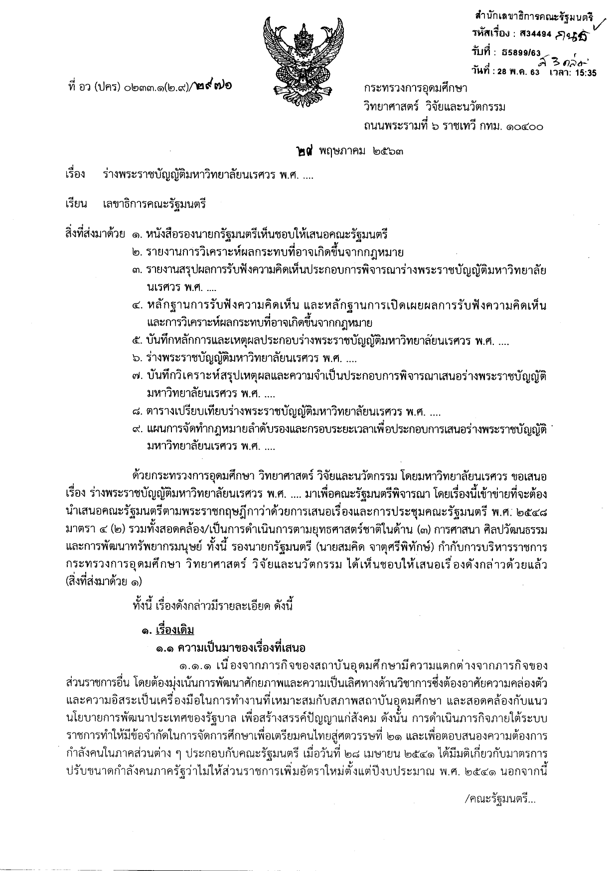 หนังสือเลขที่ อว (ปคร) 0233.1(2.9)/2971 ลงวันที่ 28 พฤษภาคม 2563 เรื่อง ร่างพระราชบัญญัติมหาวิทยาลัยนเรศวร พ.ศ.... คณะรัฐมนตรีมีมติ ดังนี้ 1. อนุมัติหลักการร่างพระราชบัญญัติมหาวิทยาลัยนเรศวร พ.ศ. .... มีสาระสำคัญเป็นการปรับปรุงพระราชบัญญัติมหาวิทยาลัยนเรศวร พ.ศ. 2533 และที่แก้ไขเพิ่มเติม โดยเปลี่ยนสถานะของมหาวิทยาลัยนเรศวรที่เป็นส่วนราชการ เป็นมหาวิทยาลัยที่มีฐานะเป็นหน่วยงานในกำกับของรัฐ (สถาบันอุดมศึกษาในกำกับของรัฐ) ที่ไม่เป็นส่วนราชการ เพื่อปรับปรุงการศึกษาระดับอุดมศึกษาให้สอดคล้องกับการเปลี่ยนแปลงทางเศรษฐกิจและสังคม และเป็นไปตามแนวทางการปฏิรูปมหาวิทยาลัยให้เป็นมหาวิทยาลัย 4.0 และนโยบายของรัฐบาล ตามที่กระทรวงการอุดมศึกษา วิทยาศาสตร์ วิจัยและนวัตกรรมเสนอ และให้ส่งสำนักงานคณะกรรมการกฤษฎีกาตรวจพิจารณา โดยให้พิจารณาในประเด็นตามข้อสังเกตของสำนักงานคณะกรรมการกฤษฎีกาที่เห็นว่า (1) การกำหนดให้อธิการบดีเลือกผู้ดำรงตำแหน่งรองอธิการบดีเป็นกรรมการสภามหาวิทยาลัย อาจไม่สอดคล้องกับมติคณะรัฐมนตรีเมื่อวันที่ 19 สิงหาคม 2546 (2) วาระการดำรงตำแหน่งของนายกสภามหาวิทยาลัย กรรมการสภามหาวิทยาลัย ผู้ทรงคุณวุฒิ และกรรมการสภามหาวิทยาลัยประเภทตัวแทนผู้บริหารและคณาจารย์ที่กำหนดไว้คราวละสองปีอาจไม่เหมาะสม จึงสมควรกำหนดให้นายกสภามหาวิทยาลัยและกรรมการสภามหาวิทยาลัยดังกล่าวมีวาระการดำรงตำแหน่งคราวละสามปีหรือสี่ปีเช่นเดียวกับมหาวิทยาลัยในกำกับของรัฐอื่น ๆ และ (3) มีการกำหนดให้แต่งตั้งคณะกรรมการขึ้นหลายคณะโดยไม่มีการกำหนดหน้าที่และอำนาจไว้อย่างชัดเจน ซึ่งไม่สอดคล้องกับพระราชบัญญัติหลักเกณฑ์การจัดทำร่างกฎหมายและการประเมินผลสัมฤทธิ์ของกฎหมาย พ.ศ. 2562 จึงไม่ควรบัญญัติมาตราเฉพาะกำหนดให้มีคณะกรรมการดังกล่าว และให้รับความเห็นเพิ่มเติมบางประการของสำนักงบประมาณ สำนักงาน ก.พ. และสำนักงาน ก.พ.ร. ไปประกอบการพิจารณา แล้วส่งให้คณะกรรมการประสานงานสภาผู้แทนราษฎรพิจารณา ก่อนเสนอสภาผู้แทนราษฎรต่อไป 2. ให้กระทรวงการอุดมศึกษา วิทยาศาสตร์ วิจัยและนวัตกรรมรับความเห็นของสำนักงบประมาณ สำนักงาน ก.พ. และสำนักงานสภาพัฒนาการเศรษฐกิจและสังคมแห่งชาติ เช่น กรณีเงินรายได้ของมหาวิทยาลัยนเรศวรที่ไม่ต้องนำส่งคืนคลังเป็นรายได้แผ่นดิน เห็นควรที่จะกำหนดให้มีการวางหลักเกณฑ์ เงื่อนไข และวิธีการเกี่ยวกับการเบิกเงิน การรับเงินและการเก็บรักษาเงินรายได้ที่ชัดเจนด้วยความระมัดระวังและรอบคอบอย่างต่อเนื่อง มีการบริหารความเสี่ยงที่เหมาะสม มีค