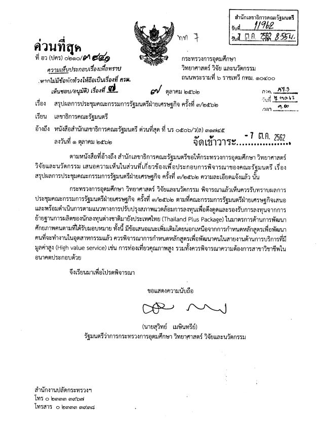 กระทรวงการอุดมศึกษา วิทยาศาสตร์ วิจัยและนวัตกรรมแห่งชาติ พิจารณารับทราบผลการประชุมคณะกรรมการรัฐมนตรีฝ่ายเศรษฐกิจ ครั้งที่ 3/2562 ตามที่คณะกรรมการรัฐมนตรีฝ่ายเศรษฐกิจเสนอและพร้อมดำเนินการตามแนวทางการปรับปรุงสภาพแวดล้อมการลงทุนเพื่อดึงดูดและรองรับการลงทุนจากการฐานการผลิตของนักลงทุนต่างชาติมายังประเทศไทย (Thailand Plus Package) ในมาตรการศักยภาพคนตามที่ได้รับมอบหมาย ทั้งนี้ มีช้อเสนอแนะเพิ่มเติมโดยนอกเหนือจากการกำหนดหลักสูตรเพื่อพัฒนาที่จะทำงานในอุดสาหกรรมแล้ว ควรพิจารณาการกำหนดหลักสูตรเพื่อพัฒนาคนในสายงานต้านการบริการที่มีมูลค่าสูง (High value service) เช่น การท่องเที่ยวคุณภาพสูง รวมทั้งควรพิจารณาความต้องการสาขาวิชาชีพในอนาคตประกอบด้วย -