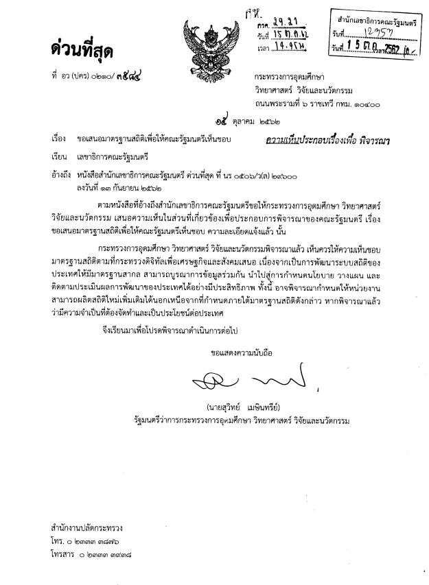 กระทรวงการอุดมศึกษา วิทยาศาสตร์ วิจัยและนวัตกรรมพิจารณาแล้ว เห็นควรให้ความเห็นชอบมาตรฐานสถิติตามที่กระทรวงดิจิทัลเพื่อเศรษฐกิจและสังคมเสนอ เนื่องจากเป็นการพัฒนาระบบสถิติของประเทศให้มีมาตรฐานสากล สามารถบูรณาการข้อมูลร่วมกัน นำไปสู่การกำหนดนโยบาย วางแผนและติดตามประเมินผลการพัฒนาของประเทศได้อย่างมีประสิทธิภาพ ทั้งนี้ อาจพิจารณากำหนดให้หน่วยงาน สามารถผลิตสถีใหม่เพิ่มเติมได้นอกเหนือจากที่กำหนดภายใต้มาตรฐานสถิติดังกล่าว หากพิจารณาแล้วว่ามีความจำเป็นที่ต้องจัดทำและเป็นประโยชน์ต่อประเทศ -