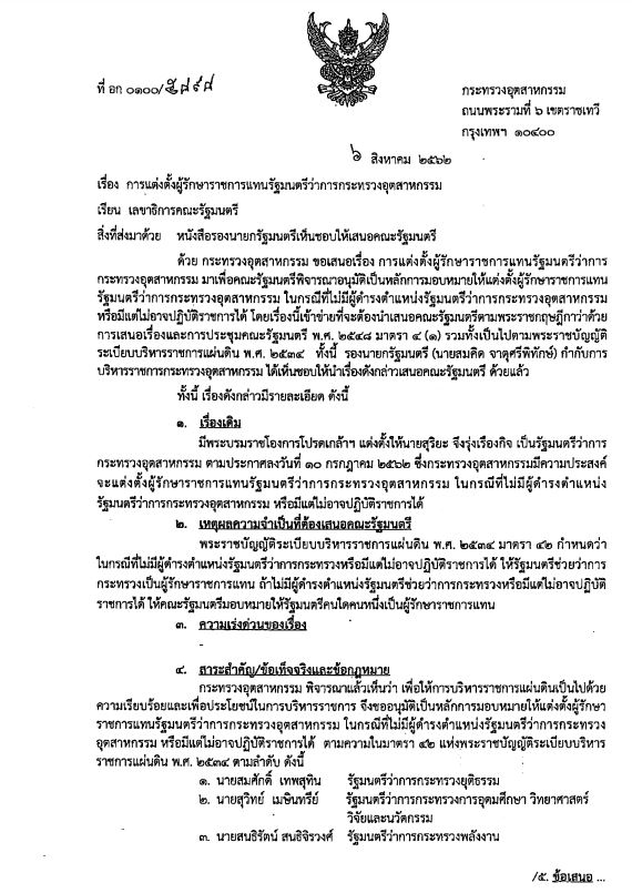กระทรวงอุตสาหกรรม พิจารณาแล้วเห็นว่า เพื่อให้การบริหารราชการแผ่นดินเป็นไปด้วยความเรียบร้อยและเพื่อประโยชน์ในการบริหารราชการ จึงขออนุมัติเป็นหลักการมอบหมายให้แต่งตั้งผู้รักษาราชการแทนรัฐมนตรีว่าการกระทรวงอุตสาหกรรม ในกรณีที่ไม่มีผู้ดำรงตำแหน่งรัฐมนตรีว่าการกระทรวงอุดสาหกรรม หรือมีแต่ไม่อาจปฏิบัติราชถารได้ ตามความในมาตร่า 42 แห่งพระราชบัญญัติระเบียบบริหารราชการแผ่นดิน พ.ศ. 2534 ตามลำดับ ดังนี้ 1. นายสมสักดิ์ เทพสุทิน รัฐมนตรีว่าการกระทรวงยุติธรรม 2. นายสุวิทย์ เมษินทรีย์ รัฐมนตรีว่าการกระทรวงการอุตมศึกษา วิทยาศาสตร์วิจัยและนวัดกรรม 3. นายสนธิรัตน์ สนธิจีรวงศ์ รัฐมนตรีว่าการกระทรวงพลังงาน