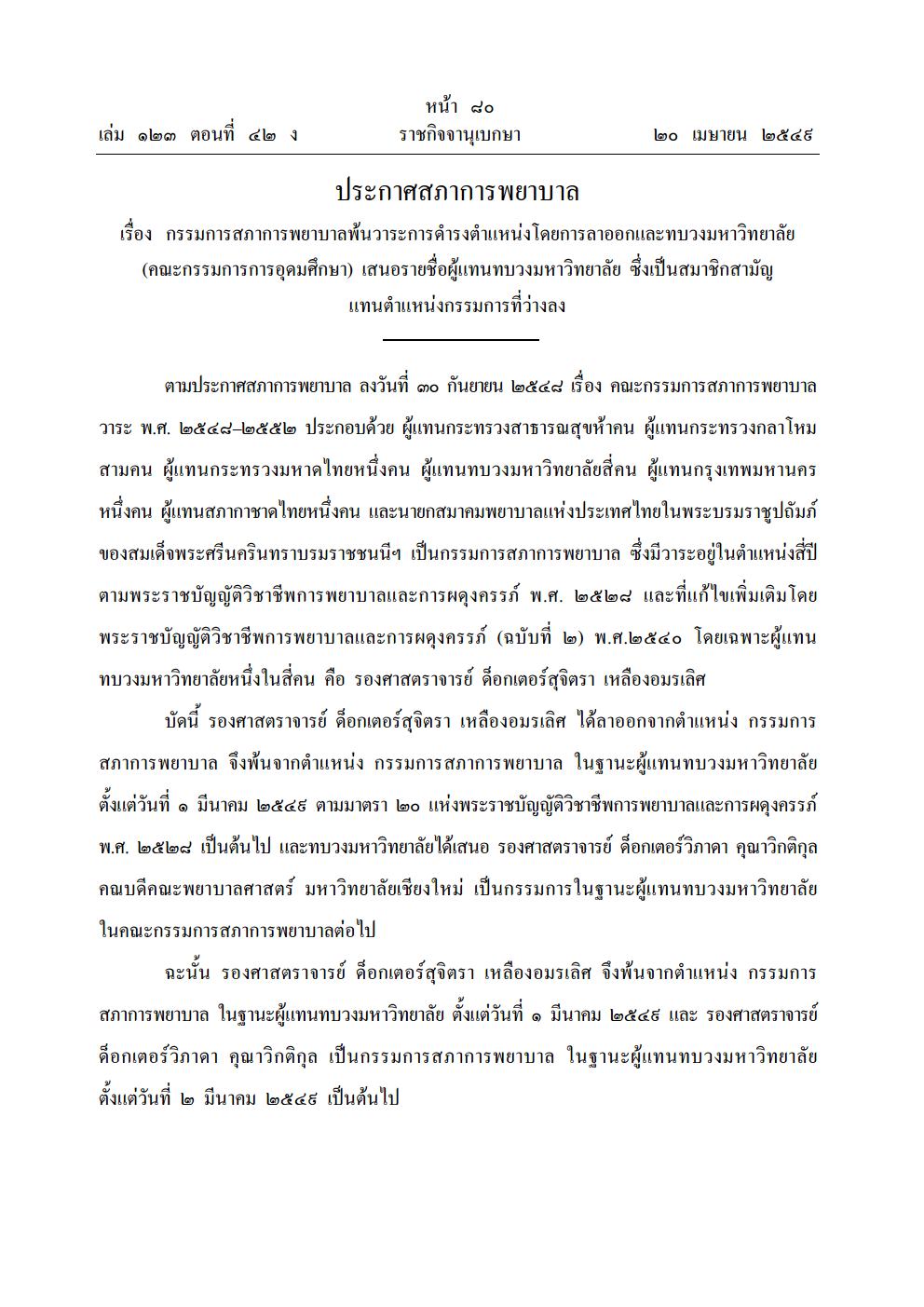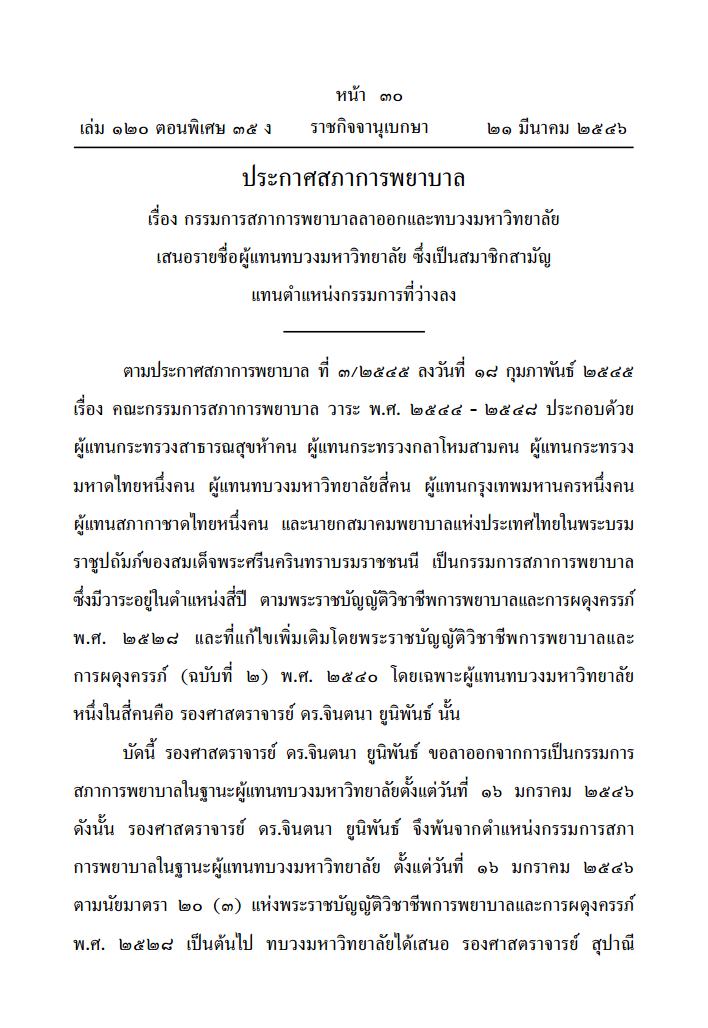 ราชกิจจานุเบกษา เล่ม 123 ตอนที่ 42 หน้า 80-81 เรื่องคำสั่งสำนักนายกรัฐมนตรี ที่ 112/2519 เรื่อง กรรมการสภาการพยาบาลพ้นวาระการดำรงตำแหน่งโดยการลาออกและทบวงมหาวิทยาลัย (คณะกรรมการการอุดมศึกษา) เสนอรายชื่อผู้แทนทบวงมหาวิทยาลัย ซึ่งเป็นสมาชิกสามัญแทนตำแหน่งกรรมการที่ว่างลง ประกาศ ณ วันที่ 21 มีนาคม 2549