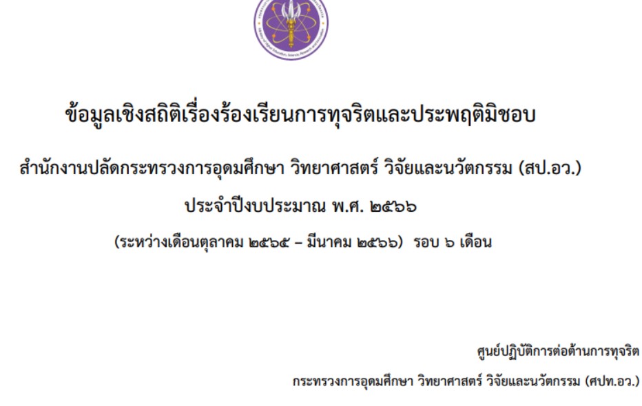 ข้อมูลเชิงสถิติเรื่องร้องเรียนการทุจริตและประพฤติมิชอบ สำนักงานปลัดกระทรวงการอุดมศึกษา วิทยาศาสตร์ วิจัยและนวัตกรรม (สป.อว.) ประจำปีงบประมาณ พ.ศ. 2566