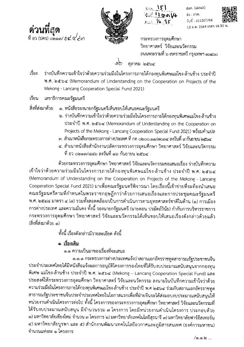 หนังสือราชการที่ อว(ปคร)0213/14843 ลงวันที่ 12 ตุลาคม 2564 กล่าวถึง กระทรวงการอุดมศึกษา วิทยาศาสตร์ วิจัยและนวัตกรรม เสนอต่อคณะรัฐมนตรี เกี่ยวกับร่างบันทึกความเข้าใจว่าด้วยความร่วมมือในโครงการภายใต้กองทุนพิเศษแม่โขง-ล้านช้าง ประจำปี พ.ศ. 2564 (Memorandum of Understanding on the Cooperation on Projects of the Mekong-Lancang Cooperation Special Fund 2021) โดย คณะรัฐมนตรีมีมติเห็นชอบร่างบันทึกความเข้าใจว่าด้วยความร่วมมือในโครงการภายใต้กองทุนพิเศษแม่โขง-ล้านช้าง ประจำปี พ.ศ. 2564 (Memorandum of Understanding on the Cooperation on Projects of the Mekong-Lancang Cooperation Special Fund 2021) และอนุมัติให้ปลัดกระทรวงการอุดมศึกษา วิทยาศาสตร์ วิจัยและนวัตกรรม หรือผู้ที่ได้รับมอบหมายเป็นผู้ลงนามในร่างบันทึกความเข้าใจฯ ประจำปี พ.ศ. 2564 โดยร่างบันทึกความเข้าใจฯ มีวัตถุประสงค์เพื่อกำหนดแนวทางในการบริหารจัดการงบประมาณของโครงการที่ได้รับการอนุมัติจากฝ่ายจีนให้เกิดประสิทธิภาพในการใช้กองทุนอย่างสูงสุด โดยมีสาระสำคัญในการสร้างชุมชนแห่งการแบ่งปันเพื่อให้เกิดสันติภาพและความมั่งคั่งในอนาคตต่อสมาชิกแม่โขง-ล้านช้าง และปฏิบัติตามเจตนารมณ์ในการปรึกษาหารือ การร่วมมือกัน การช่วยเหลือกันและมีผลประโยชน์ร่วมกัน โดยเคารพกฎหมายและกฎระเบียบของทั้งประเทศไทยและสาธารณรัฐประชาชนจีน และร่วมกันติดตามประเมินโครงการและการใช้จ่ายงบประมาณจากกองทุน ตามที่กระทรวงการอุดมศึกษา วิทยาศาสตร์ วิจัยและนวัตกรรมเสนอ และหากมีความจำเป็นต้องปรับเปลี่ยนร่างบันทึกความเข้าใจว่าด้วยความร่วมมือในโครงการภายใต้กองทุนพิเศษแม่โขง-ล้านช้าง ประจำปี พ.ศ. 2564 ในส่วนที่ไม่ใช่สาระสำคัญและไม่ขัดกับหลักการที่คณะรัฐมนตรีได้ให้ความเห็นชอบไว้ ให้กระทรวงการอุดมศึกษา วิทยาศาสตร์ วิจัยและนวัตกรรมดำเนินการได้ โดยให้นำเสนอคณะรัฐมนตรีทราบภายหลัง พร้อมทั้งให้ชี้แจงเหุตผลและประโยชน์ที่ไทยได้รับจากการปรับเปลี่ยนดังกล่าว -