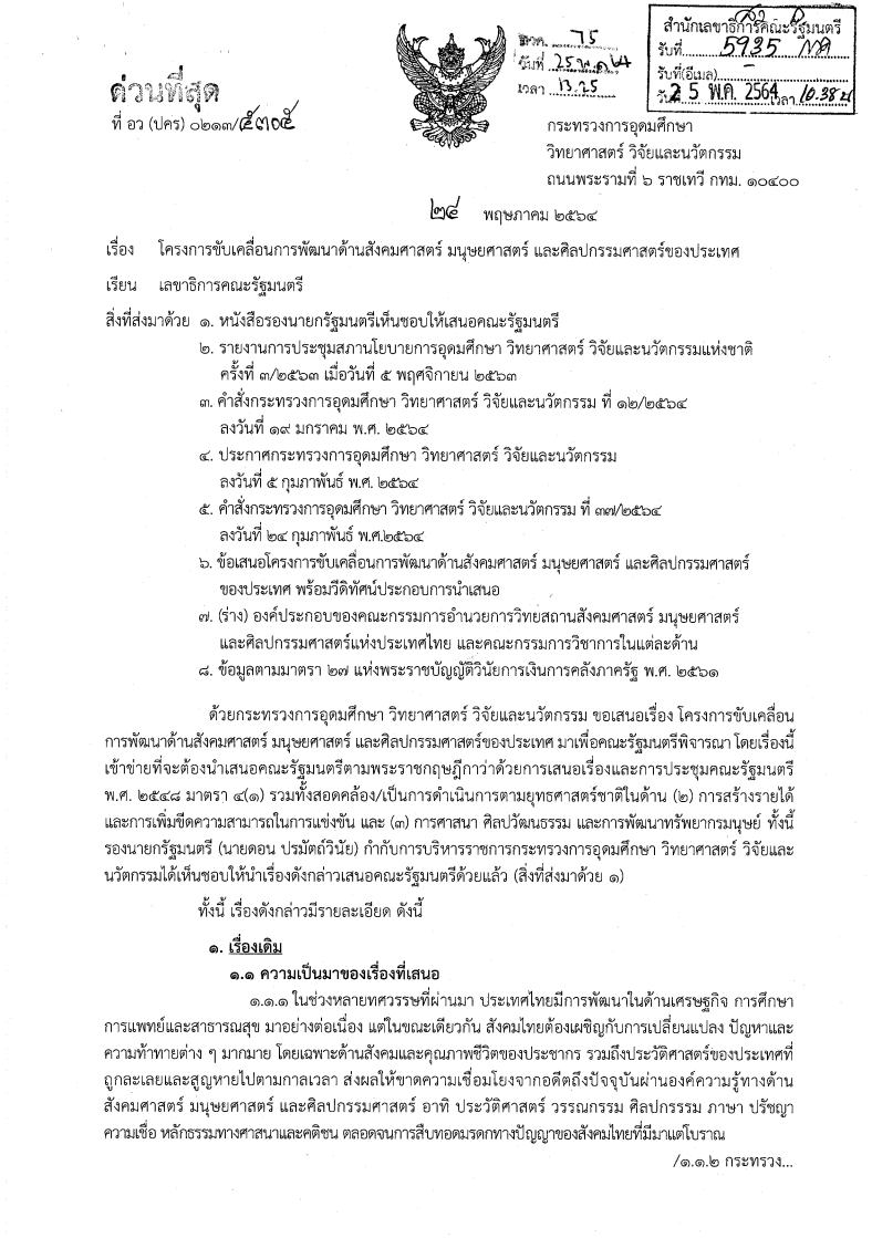 หนังสือราชการที่ อว(ปคร)0213/5305 ลงวันที่ 24 พฤษภาคม 2564 กล่าวถึง กระทรวงการอุดมศึกษา วิทยาศาสตร์ วิจัยและนวัตกรรม เสนอต่อคณะรัฐมนตรี เกี่ยวกับโครงการขับเคลื่อนการพัฒนาด้านสังคมศาสตร์ มนุษยศาสตร์ และศิลปกรรมศาสตร์ของประเทศ โดยคณะรัฐมนตรีมีมติรับทราบโครงการขับเคลื่อนการพัฒนาด้านสังคมศาสตร์ มนุษยศาสตร์ และศิลปกรรมศาสตร์ของประเทศ โดยมีวิทยสถานสังคมศาสตร์ มนุษยศาสตร์ และศิลปกรรมศาสตร์แห่งประเทศไทยเป็นกลสำคัญในการขับเคลื่อนการดำเนินงาน และเห็นชอบองค์ประกอบของคณะกรรมการระดับนโยบายและระดับบริหารสำหรับโครงการฯ โดยมีคณะกรรมการอำนวยการวิทยสถานสังคมศาสตร์ มนุษยศาสตร์ และศิลปกรรมศาสตร์แห่งประเทศไทย และคณะกรรมการวิชาการในแต่ละด้าน ของกระทรวงการอุดมศึกษา วิทยาศาสตร์ วิจัยและนวัตกรรม และให้กระทรวงการอุดมศึกษา วิทยาศาสตร์ วิจัยและนวัตกรรมรับข้อสังเกตของกระทรวงการพัฒนาสังคมและความมั่นคงของมนุษย์ และความเห็นของสำนักงบประมาณ และสำนักงานสภาพัฒนาการเศรษฐกิจและสังคมแห่งชาติ เช่น การสร้างและพัฒนากำลังคน และทุนทางปัญญา การพัฒนาองค์ความรู้ในประเด็น สุวรรณภูมิศึกษา โลกคดีศึกษา เศรษฐกิจพอเพียง พิพิธภัณฑ์ศิลปกรรมแห่งชาติ และช่างศิลป์ท้องถิ่น การสร้างเครือข่ายในรูปแบบ Consortium การสนับสนุนการพัฒนาบนฐานทุนทางสังคมและวัฒนธรรม การนำเสนอผลงานทางวิชาการ และการจัดเวทีวิชาการ ควรกำหนดค่าเป้าหมาย ตัวชี้วัด ผลสัมฤทธิ์ และประโยชน์ที่จะได้รับตามกลุ่มเป้าหมายหรือประชาชนจะได้รับเชิงคุณภาพเป็นสำคัญ และควรพิจารณาถึงความเหมาะสมในการขับเคลื่อนโครงการที่เสนอให้มีการจัดตั้งวิทยสถานสังคมศาสตร์ มนุษยศาสตร์ และศิลปกรรมศาสตร์แห่งประเทศไทยให้เป็นสถาบันเฉพาะทางดำเนินงานด้านสุวรรณภูมิศึกษา โลกคดีศึกษา เศรษฐกิจพอเพียง พิพิธภัณฑ์ศิลปกรรมแห่งชาติ และช่างศิลป์ท้องถิ่น ที่ปัจจุบันมีหลายหน่วยงานทั้งภาครัฐ เอกชน และภาคประชาสังคมดำเนินการอยู่ -
