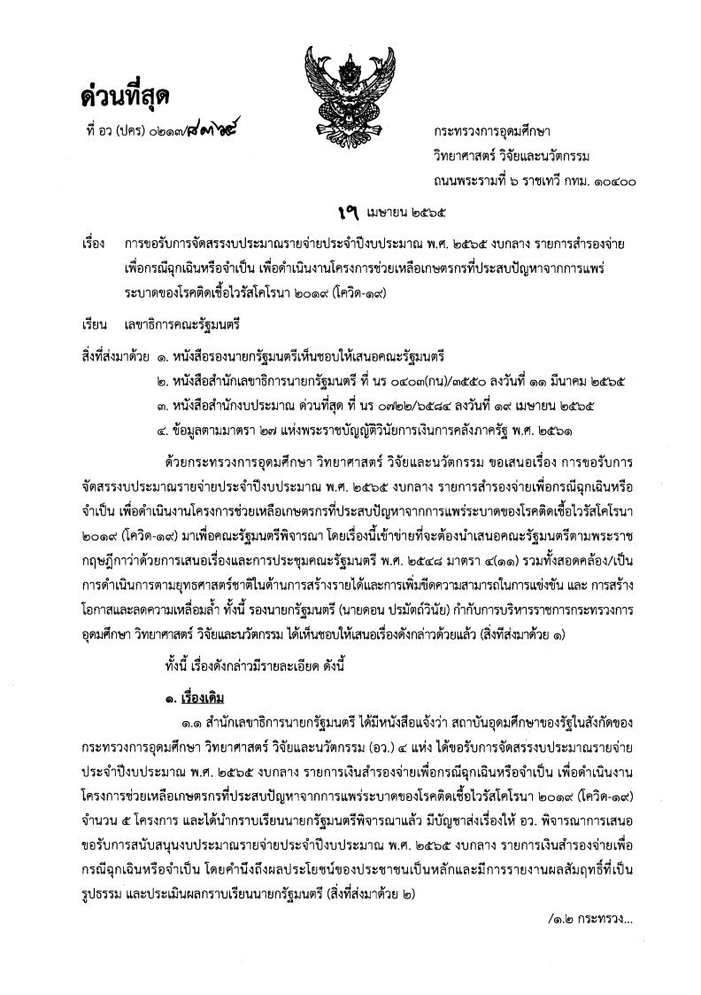 หนังสือราชการที่ อว(ปคร)0213/8365 ลงวันที่ 19 เมษายน 2565 กล่าวถึง กระทรวงการอุดมศึกษา วิทยาศาสตร์ วิจัยและนวัตกรรม เสนอต่อคณะรัฐมนตรี เพื่อขอรับการจัดสรรงบประมาณรายจ่ายประจำปีงบประมาณ พ.ศ. 2565 งบกลาง รายการเงินสำรองจ่ายเพื่อกรณีฉุกเฉินหรือจำเป็น เพื่อดำเนินงานโครงการช่วยเหลือเกษตรกรที่ประสบปัญหาจากการแพร่ระบาดของโรคติดเชื้อไวรัสโคโรนา 2019 (โควิด-19) โดยคณะรัฐมนตรีมีมติ 1. อนุมัติงบประมาณรายจ่ายงบกลาง รายการเงินสำรองจ่ายเพื่อกรณีฉุกเฉินหรือจำเป็น เพื่อดำเนินงานโครงการช่วยเหลือเกษตรกรที่ประสบปัญหาจากการแพร่ระบาดของโรคติดเชื้อไวรัสโคโรนา 2019 (โควิด-19) วงเงินรวมทั้งสิ้น 2,054,053,900 บาท ตามที่กระทรวงการอุดมศึกษา วิทยาศาสตร์ วิจัยและนวัตกรรมเสนอ ทั้งนี้ ให้กระทรวงการอุดมศึกษา วิทยาศาสตร์ วิจัยและนวัตกรรมรับความเห็นของสำนักงบประมาณ (หนังสือสำนักงบประมาณ ด่วนที่สุด ที่ นร 0722/6584 ลงวันที่ 19 เมษายน 2565) ที่เห็นควรบูรณาการและพิจารณาตรวจสอบไม่ให้เกิดความซ้ำซ้อนกับโครงการของภาครัฐที่ดำเนินการในลักษณะเดียว รวมทั้งพิจารณาดำเนินการให้ครอบคลุมกลุ่มเป้าหมายอย่างเหมาะสม และเมื่อโครงการเสร็จสิ้นแล้ว ควรส่งต่อให้กระทรวงเกษตรและสหกรณ์รับผิดชอบในการส่งเสริมความเข็มแข็งของเครือข่ายวิสาหกิจชุมชนท้องถิ่นไทยให้เกิดความยั่งยืนต่อไป -