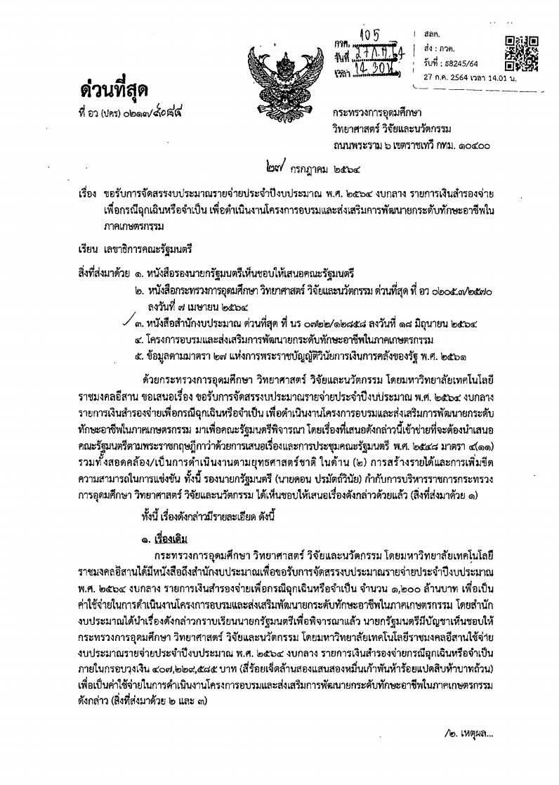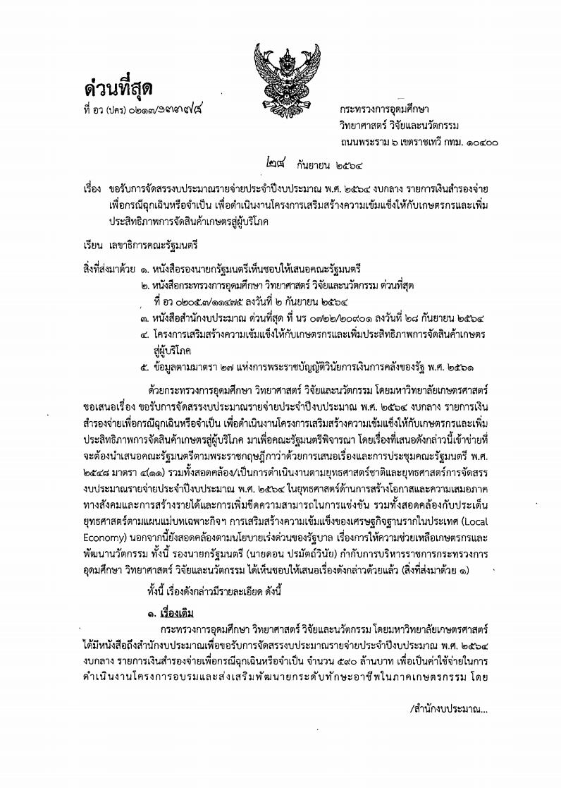หนังสือราชการที่ อว(ปคร)0213/9088 ลงวันที่ 27 กรกฎาคม 2564 กล่าวถึง กระทรวงการอุดมศึกษา วิทยาศาสตร์ วิจัยและนวัตกรรม เสนอต่อคณะรัฐมนตรี เกี่ยวกับการขอรับการจัดสรรงบประมาณรายจ่ายประจำปีงบประมาณ พ.ศ. 2564 งบกลาง รายการเงินสำรองจ่ายเพื่อกรณีฉุกเฉินหรือจำเป็น เพื่อดำเนินงานโครงการอบรมและส่งเสริมการพัฒนายกระดับทักษะอาชีพในภาคเกษตรกรรม โดยคณะรัฐมนตรีมีมติอนุมัติการจัดสรรงบประมาณรายจ่ายประจำปีงบประมาณ พ.ศ. 2564 งบกลาง รายการเงินสำรองจ่ายเพื่อกรณีฉุกเฉินหรือจำเป็น เพื่อเป็นค่าใช้จ่ายในการดำเนินงานโครงการอบรมและส่งเสริมการพัฒนายกระดับทักษะอาชีพในภาคเกษตรกรรม (โครงการอบรมฯ) ภายในกรอบวงเงิน 407,229,585 บาท ซึ่งมีวัตถุประสงค์ ดังนี้ 1.เพื่ออบรมและส่งเสริมการพัฒนายกระดับทักษะอาชีพในภาคเกษตรกรรม ด้านปศุสัตว์ ด้านประมง สินค้าหนึ่งตำบลหนึ่งผลิตภัณฑ์ (OTOP) พืชและเห็ดเศรษฐกิจ หมอดิน New Normal และพืชสมุนไพร 2. เพื่อรองรับแรงงานคืนถิ่น พลิกฟื้นอาชีพด้านเกษตรกรรมด้วยศาสตร์พระราชา เพื่อเป็นแนวทางในการแก้ไขเยียวยาแก่ผู้ที่ได้รับผลกระทบจากวิกฤตเศรษฐกิจ รวมถึงวิกฤตของโรคโควิด 19 เพื่อเป็นทางรอดและสร้างภูมิคุ้มกันให้กับชุมชน 3. เพื่อสร้างต้นแบบเรียนรู้และถ่ายทอดเทคโนโลยี และส่งเสริมการพัฒนายกระดับทักษะอาชีพในภาคเกษตรกรรม กลุ่มเป้าหมาย เครือข่ายหมู่บ้านวิสาหกิจชุมชนท้องถิ่นทั่วทุกภาคของประเทศ จำนวน 2,574 กลุ่ม ประมาณ 25,740 ราย ดำเนินการโดยจัดกิจกรรมฝึกอบรมและส่งเสริมการพัฒนาอาชีพด้านต่าง ๆ ตามวัตุประสงค์ และระยะเวลาดำเนินโครงการฯ ปีงบประมาณ พ.ศ. 2564-2565 (เริ่มเดือนกรกฎาคม 2564) ตามที่กระทรวงอุดมศึกษา วิทยาศาสตร์ วิจัยและนวัตกรรมเสนอ และให้กระทรวงอุดมศึกษา วิทยาศาสตร์ วิจัยและนวัตกรรม และหน่วยงานที่เกี่ยวข้องรับความเห็นของกระทรวงสาธารณสุขและสำนักงานสภาพัฒนาการเศรษฐกิจและสังคมแห่งชาติ โดยให้หน่วยงานทั้งภาครัฐและเอกชนจัดการอบรม สัมมนา หรือการประชุมโดยวิธีการทางอิเล็กทรอนิกส์เป็นหลัก รวมถึงการปฏิบัติตามมาตรการของกระทรวงสาธารณสุขอย่างเคร่งครัด และควรร่วมมือกับหน่วยงานในระดับพื้นที่ โดยเฉพาะกระทรวงเกษตรและสหกรณ์ที่เป็นหน่วยงานที่กำกับดูแลด้านการเกษตร รวมถึงการพัฒนาเกษตรกรและวิสาหกิจชุมชน -