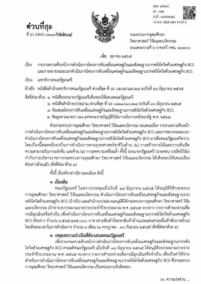 หนังสือราชการที่ อว(ปคร)0213/22204 ลงวันที่ 12 ตุลาคม 2565 กล่าวถึง กระทรวงการอุดมศึกษา วิทยาศาสตร์ วิจัยและนวัตกรรม เสนอต่อคณะรัฐมนตรี เกี่ยวกับรายงานความคืบหน้าการดำเนินการโครงการขับเคลื่อนเศรษฐกิจและสังคมฐานรากหลังโควิดด้วยเศรษฐกิจ BCG และการขยายระยะเวลาดำเนินการโครงการขับเคลื่อนเศรษฐกิจและสังคมฐานรากหลังโควิดด้วยเศรษฐกิจ BCG โดยคณะรัฐมนตรีมีมติรับทราบความคืบหน้าการดำเนินการโครงการขับเคลื่อนเศรษฐกิจและสังคมฐานรากหลังโควิดด้วยเศรษฐกิจ BCG และการขยายระยะเวลาดำเนินการโครงการขับเคลื่อนเศรษฐกิจและสังคมฐานรากหลังโควิดด้วยเศรษฐกิจ BCG จากระยะเวลา 3 เดือน (1 กรกฎาคม-30กันยายน 2565) เป็นระยะเวลา 9 เดือน (1 กรกฎาคม 2565-31 มีนาคม 2566) ซึ่งโครงการดังกล่าวเป็นการต่อยอดการดำเนินการจาก “โครงการยกระดับเศรษฐกิจและสังคมรายตำบลแบบบูรณาการ” (1 ตำบล 1 มหาวิทยาลัย) เพื่อเพิ่มศักยภาพและขีดความสามารถในการแข่งขันของภาคการผลิตและบริการด้าน BCG ในพื้นที่ โดยเพิ่มการจ้างงานบัณฑิตจบใหม่ไม่เกิน 5 ปี และผู้ที่ถูกเลิกจ้าง/ประชาชนในพื้นที่ ครอบคลุม 7,435 ตำบล ทั่วประเทศ โดยผลการดำเนินการของโครงการดังกล่าวมีผู้ผ่านการคัดเลือกเข้าร่วมโครงการ จำนวน 64,428 คน คิดเป็นร้อยละ 94.26 จากเป้าหมาย 68,350 คน กิจกรรมที่ดำเนินการในพื้นที่ รวม 15,631 โครงการ และสถาบันอุดมศึกษาที่รับผิดชอบในแต่ละพื้นที่ จำนวน 98 แห่ง ทำหน้าที่เป็นผู้บูรณาการระบบ (System Integrator) ในการขับเคลื่อนเศรษฐกิจ BCG ในพื้นที่ ให้มีการเติบโตอย่างยั่งยืน โดยใช้องค์ความรู้ เทคโนโลยีและนวัตกรรม ซึ่งมีการใช้จ่ายงบประมาณ จำนวน 2,701.61 ล้านบาท คิดเป็นร้อยละ 75.76 ของงบประมาณที่ได้รับการจัดสรร (จำนวน 3,565.84 ล้านบาท) โดยในส่วนของงบประมาณส่วนที่เหลือ สำนักงานปลัดกระทรวงการอุดมศึกษา วิทยาศาสตร์ วิจัยและนวัตกรรมจะได้ประสานกับสำนักงบประมาณและหน่วยงานที่เกี่ยวข้องเกี่ยวกับการขยายระยะเวลาและการเบิกจ่ายงบประมาณสำหรับการดำเนินการโครงการดังกล่าวต่อไป ทั้งนี้ การขยายระยะเวลาการดำเนินการโครงการดังกล่าวอีก 6 เดือน (1 ตุลาคม 2565-31 มีนาคม 2566) จะเป็นการดำเนินการในส่วนของกิจกรรมที่จำเป็นที่ต้องดำเนินการภายหลังจากที่ได้ผลลัพธ์จากการดำเนินการในระยะเวลา 3 เดือน -