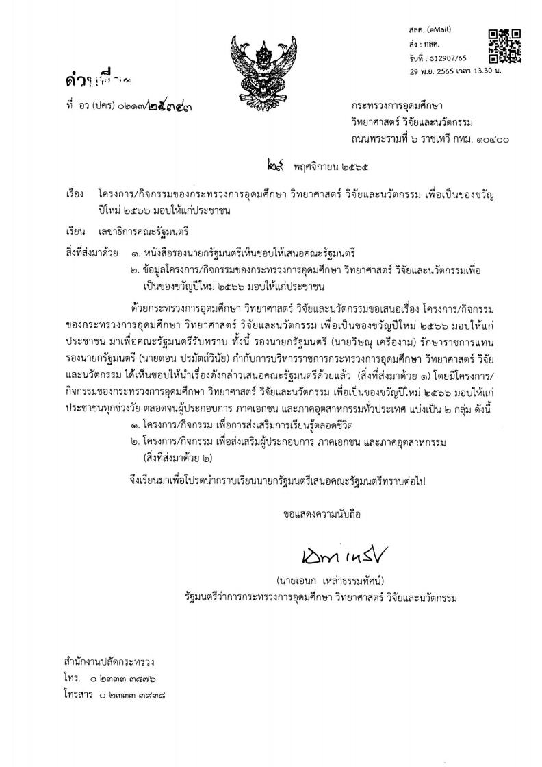 หนังสือราชการที่ อว(ปคร)0213/25343 ลงวันที่ 29 พฤศจิกายน 2565 กล่าวถึง กระทรวงการอุดมศึกษา วิทยาศาสตร์ วิจัยและนวัตกรรม เสนอต่อคณะรัฐมนตรี เกี่ยวกับโครงการ/กิจกรรมของกระทรวงการอุดมศึกษา วิทยาศาสตร์ วิจัยและนวัตกรรม เพื่อมอบเป็นของขวัญปีใหม่ 2566 มอบให้แก่ประชาชน รวม 14 กิจกรรม แบ่งเป็น 1. กิจกรรม เพื่อส่งเสริมการเรียนรู้ตลอดชีวิต จำนวน 11 กิจกรรม 2. กิจกรรม เพื่อส่งเสริมผู้ประกอบการ ภาคเอกชน และภาคอุตสาหกรรม จำนวน 3 กิจกรรม -
